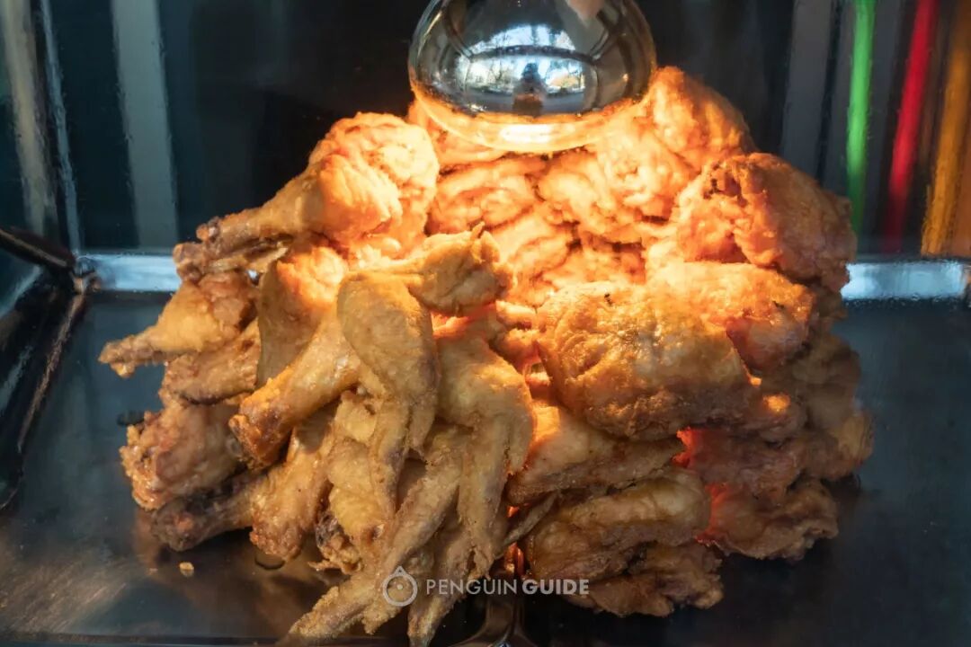 两鬓斑白的老爷爷端着刚炸好的鸡腿鸡翅和鸡胸,一块一块垒成小山。