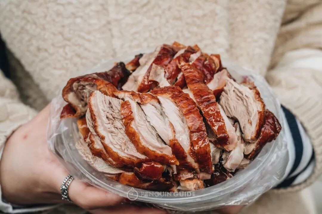 赶紧麻溜地让老板切了半只烤鸭,鸭脯和鸭座都要尝到。