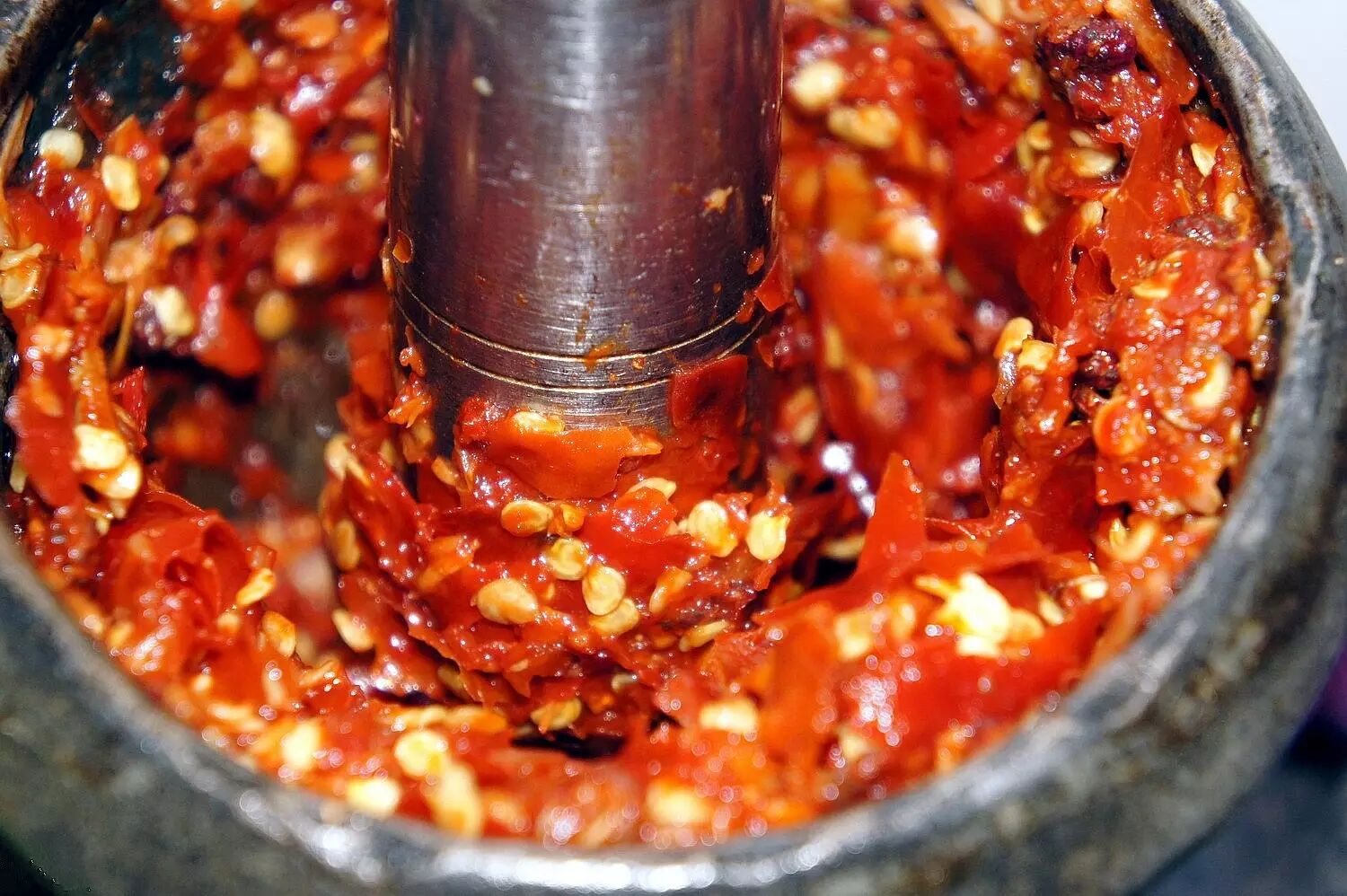 七星椒也是朝天椒的一种,皮薄肉厚,比子弹头更辣更醇厚。把晾晒干的七星椒和二荆条去蒂后再加姜、蒜、一起捣碎做成糍粑海椒,软糯香辣,是非常好的调料和佐饭美味。
