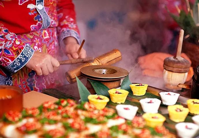 制作者从已经煮好并用木槌舂茸的糯米抓出一大团,分成三小坨后,依次摔向案板,然后小糯米团会朝对面装满芝麻黄豆粉的竹簸中飞去。