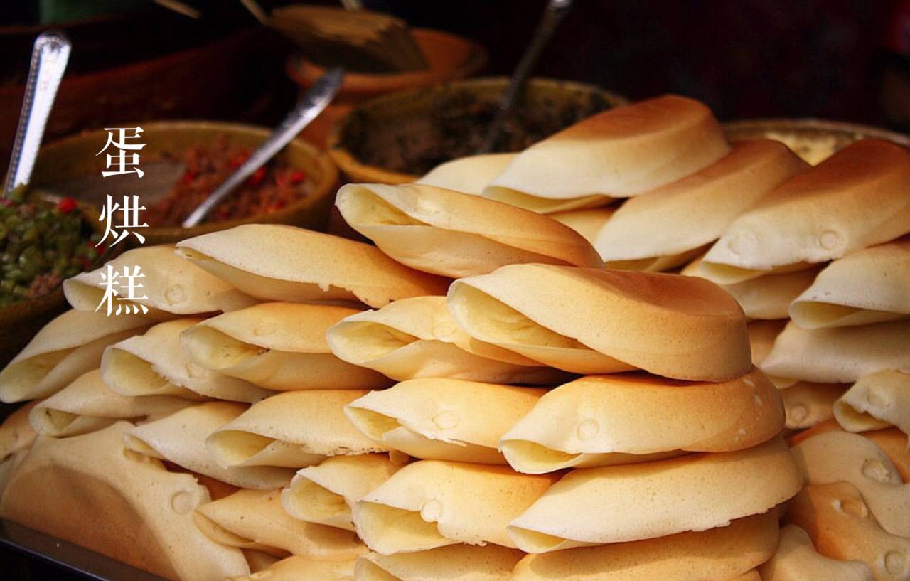 蛋烘糕是用鸡蛋、发酵过的面粉加适量红糖调匀,在平锅上烘煎而成,再包入咸馅或甜馅食用,在成都的历史可以追溯到清道光年间。