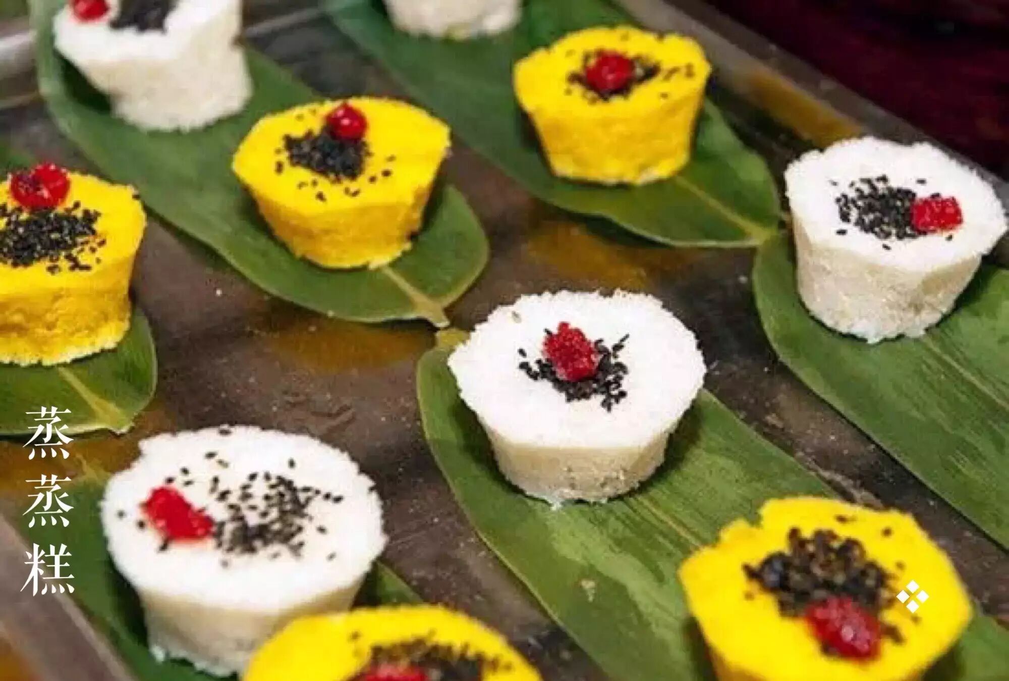 为了招揽生意,小贩会把蒸蒸糕做得卖相可掬,色泽油亮或者白里透红、带点浅黄,糕点刚好一口大小,糯软甜酥得很。