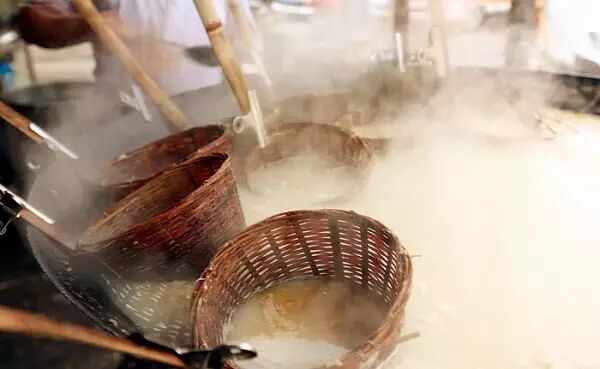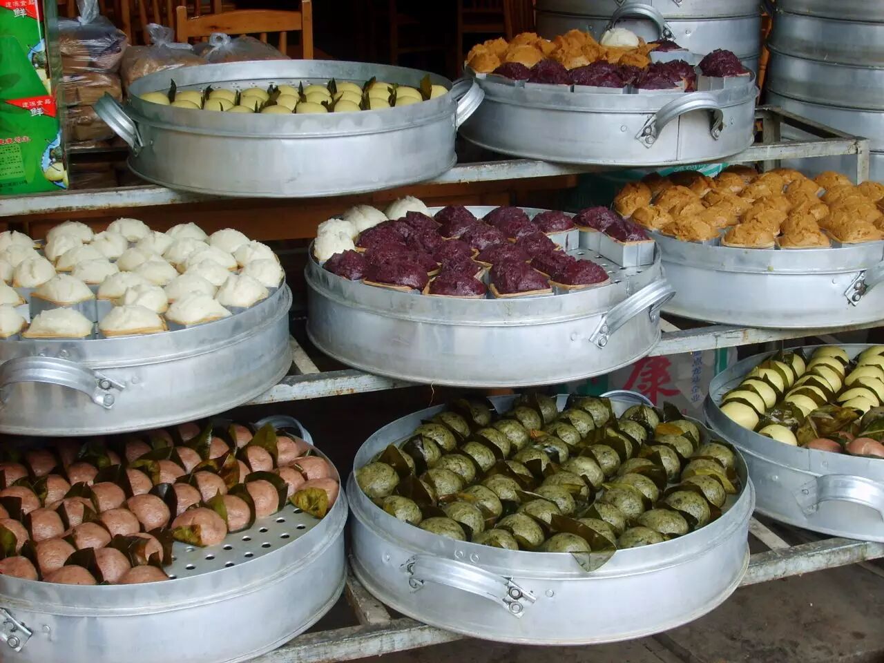 蒸蒸糕用的米粉(或者玉米粉)非常细,被炒制过后加上糖和喜沙,放到用麻柳树或泡桐树专门挖制而成的桶里蒸上几分钟就好。