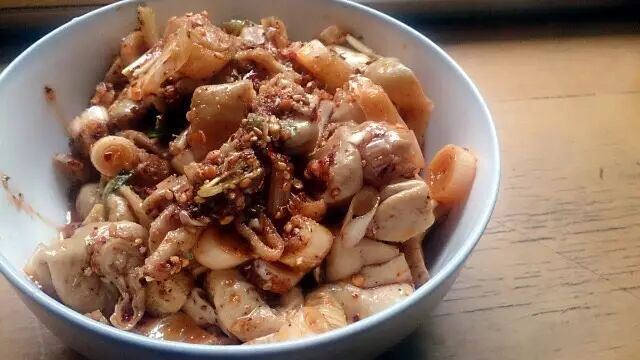 吃起来的时候粉条粗细并不均匀,但是和机器压制出来的整整齐齐的粉条相比,韧劲十足,口感好太多。要是加上几勺醋,则会变成上好的酸辣粉。