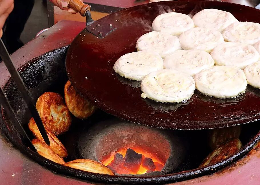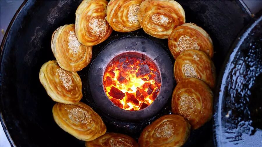 锅盔的馅料也有很多种,牛肉、猪肉、红糖、椒盐……其中最受欢迎的莫过于牛肉和椒盐。包好馅的锅盔在平锅里烙得吱吱作响,两面金黄后用火钳夹到平锅下的壁炉里烘烤。
