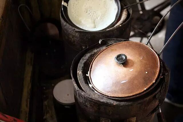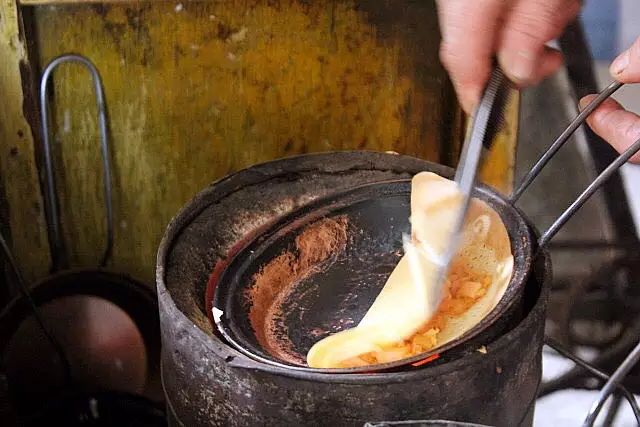 最喜欢的莫过于看着小贩娴熟地舀一勺分量刚好的面糊,在直径不超过10厘米的小圆铜锅里来回晃两圈,然后拿镊子样的夹子把外皮已经烤成琥珀色的蛋烘糕取下对折,填上所选的馅料。