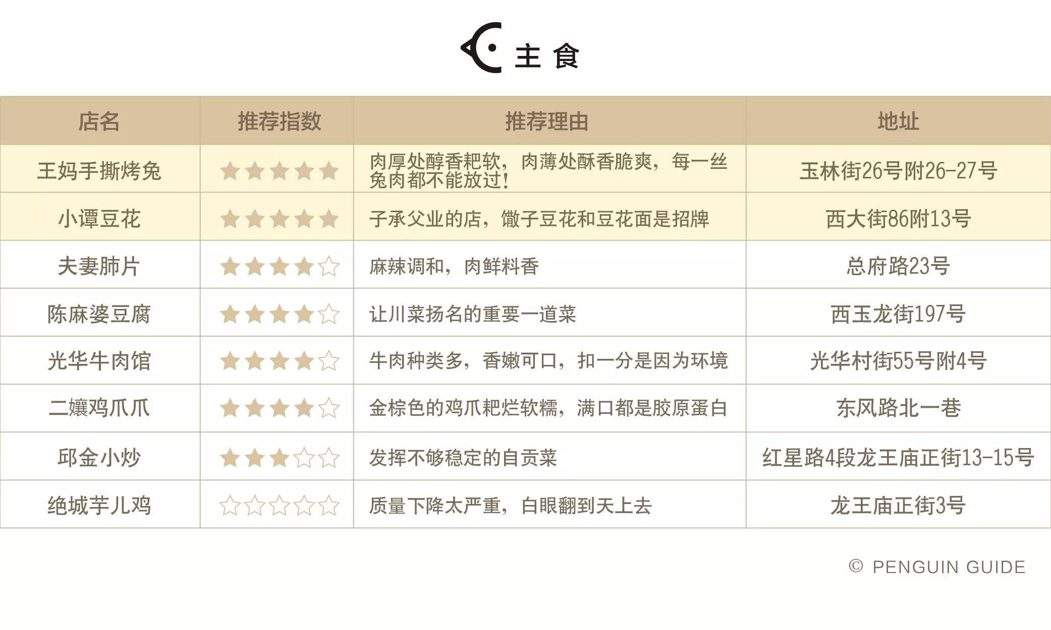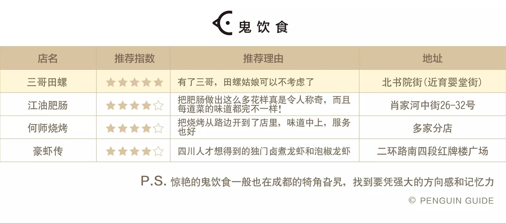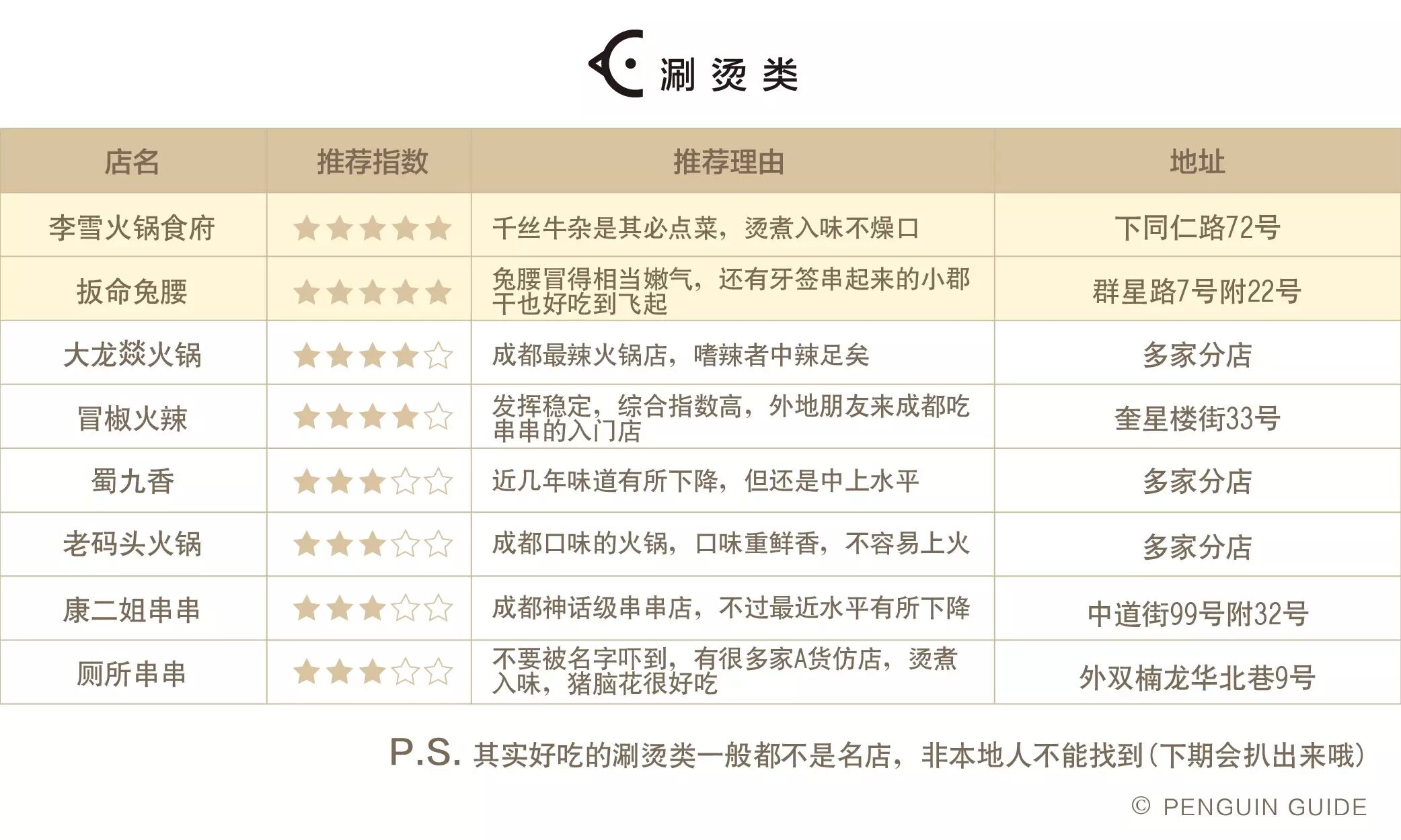 此时,雷锋企鹅又出现了:我们吃了成都 30 多家老字号和声名在外的馆子,跟各位来聊聊它们是否名符其实——本地人到底吃不吃,还是专门来豁(四川话:忽悠)外地人的。