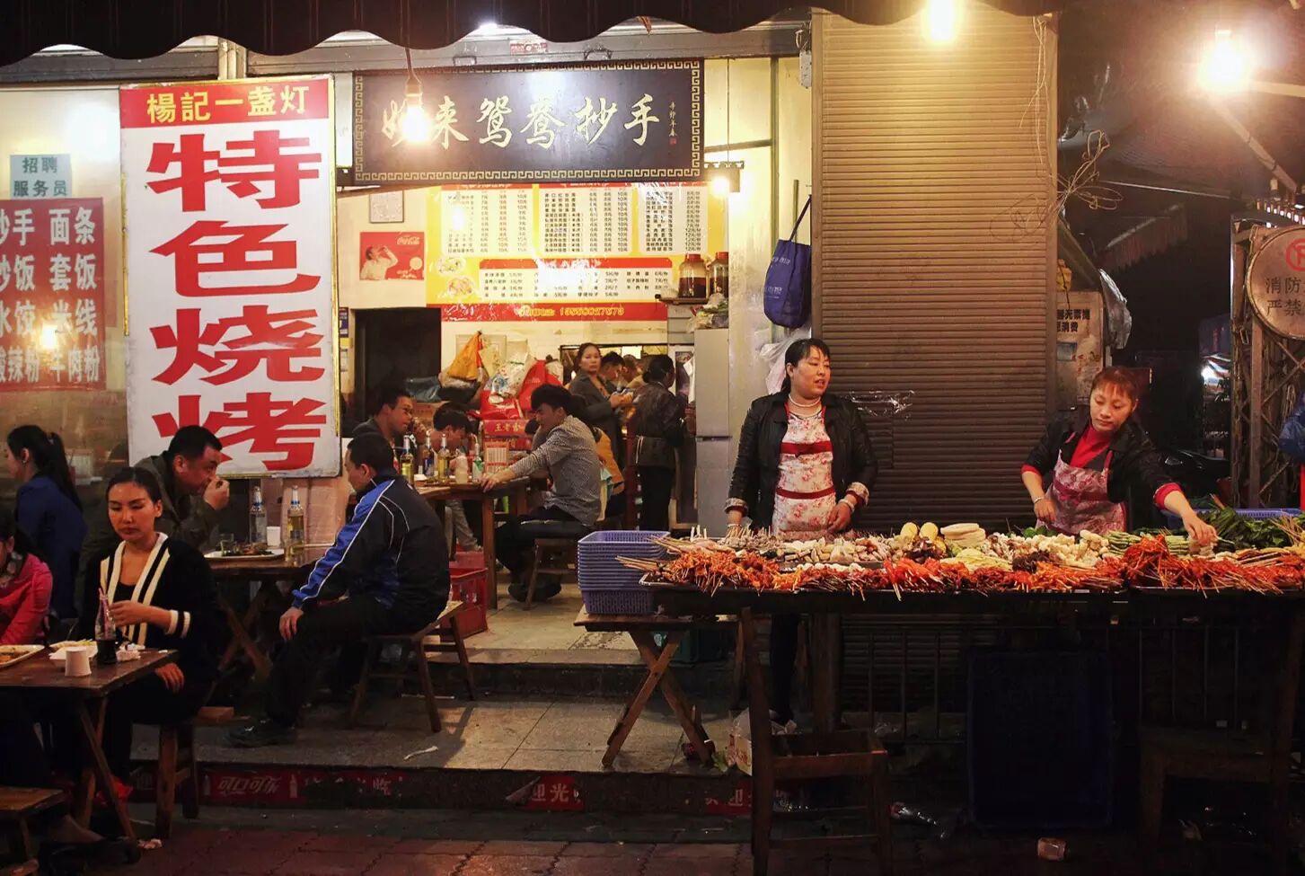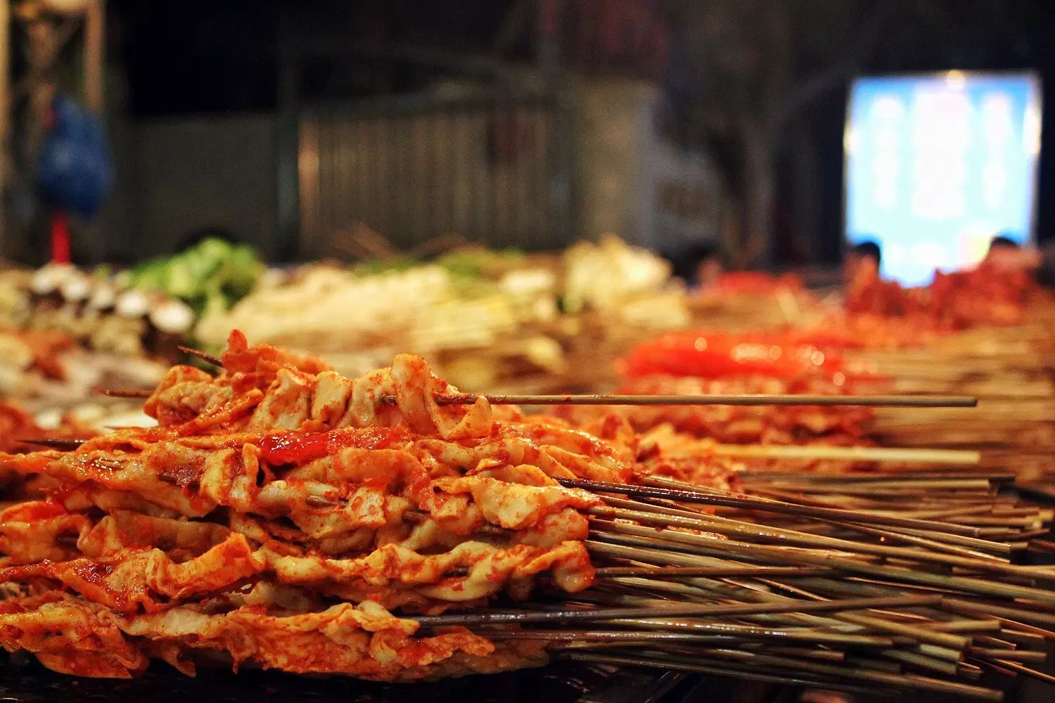 可别以为抢到号拿到位置了就可以得意洋洋了,店内才是考真功夫的地方。六个大冰柜里塞满了各类荤素串串,你要想吃到它们,就得抛开你的形象,见缝就钻,偶尔还要遭受别人手上串串签的“攻击”,可谓是使劲浑身解数。
