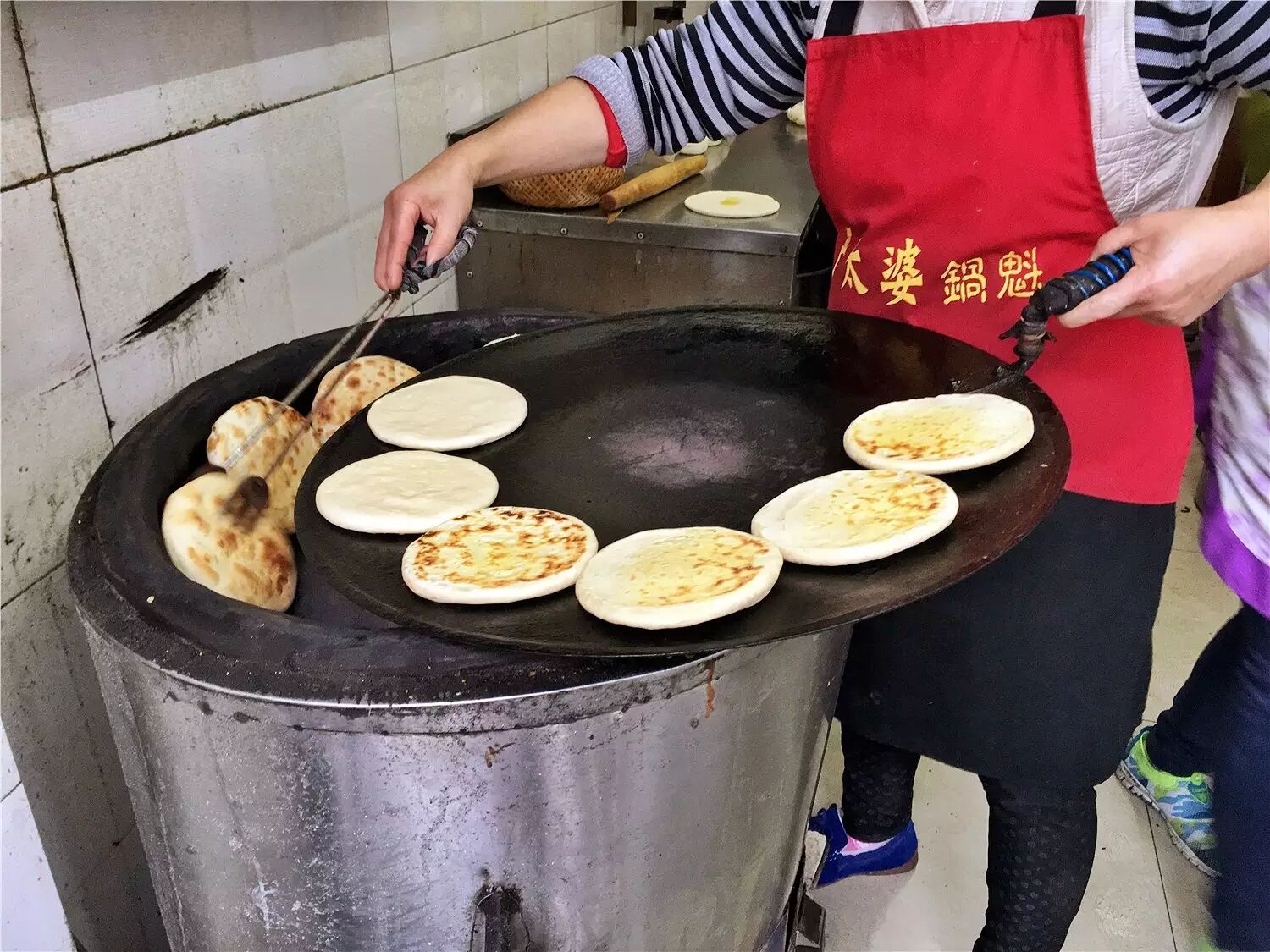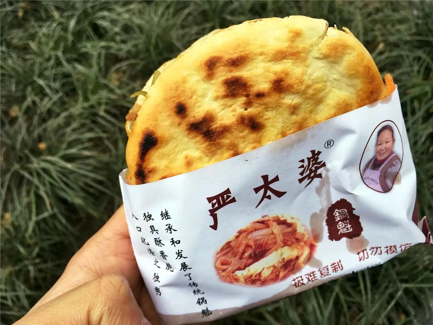 在严太婆这儿多年风雨不变的是一条串成线的队伍,其中不乏有各种颜色肤色和发色的外国人混在里头。于是,美貌(年轻时)与智慧并存的严太婆与老顾客一同给锅魁起了英文名,译作 Guo Kui,也叫 Sichuan stylepie,从此价目表上就出现了中英两种语言。