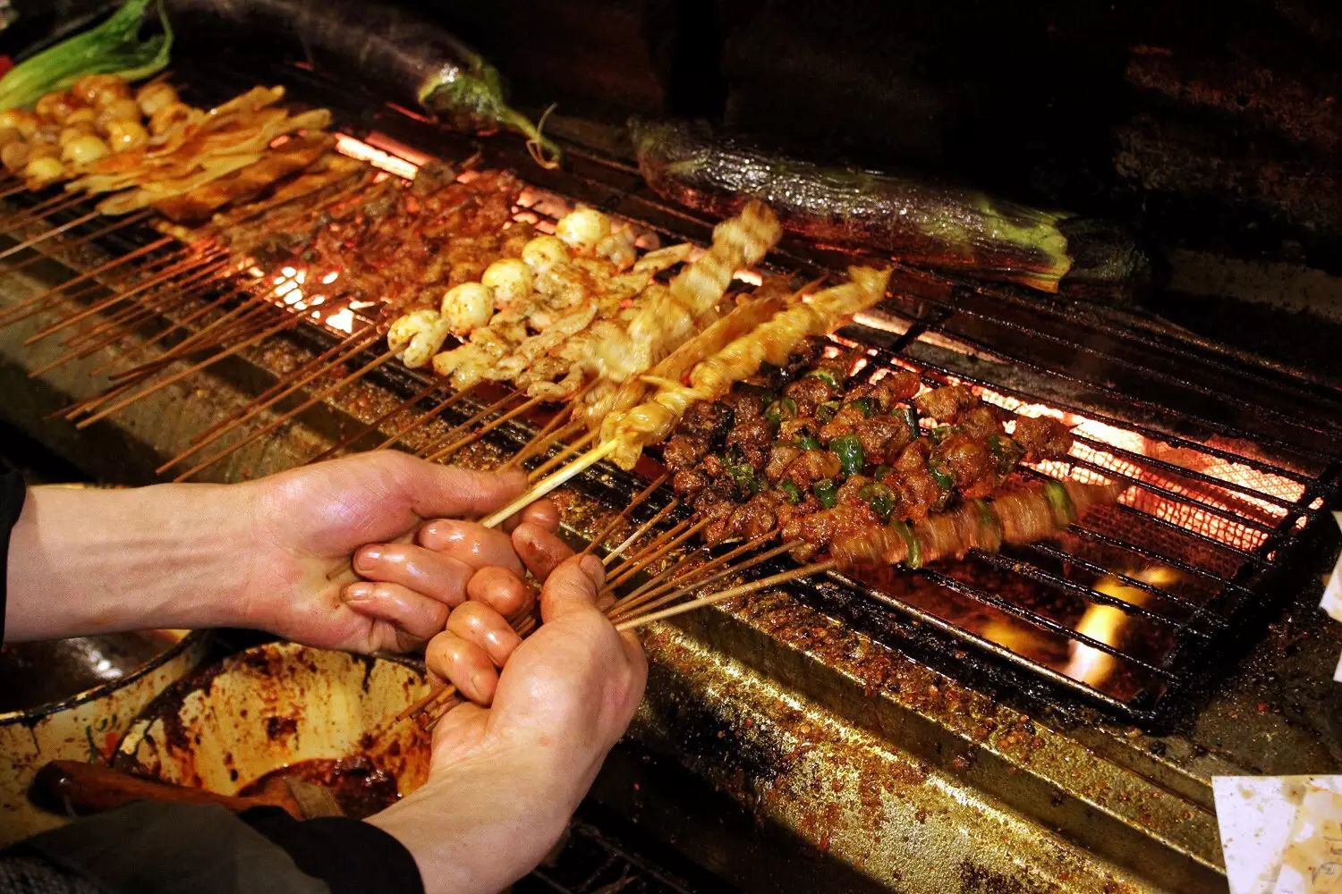 烧烤师傅会先在油锅里滚炸一下,然后烤制。这样的五花肉内嫩外酥,只是里面会稍显油腻。