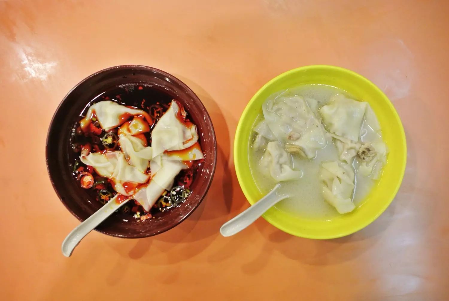 清汤和红油各要了一份,煞有其事地开始品尝。清汤的原汤是用鸡肉、鸭肉和猪肉经过猛炖慢煨而成,汤底白而浓,一口下去感受到了实在的味精味道。红油的辣味没有出来,吃起来完全不香,对的,是完全。
