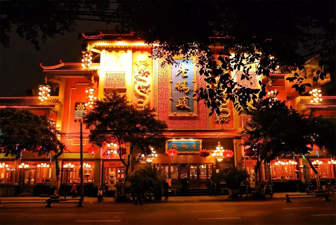 老码头的发源之地便是在玉林路上,这家总店的招牌“老码头”三个大字是以烫金工艺制成的,名副其实的金漆招牌。其面积之大也是有点吓人,100米长、18米高,气派抢眼,在成都火锅界也是一张响当当的名片。