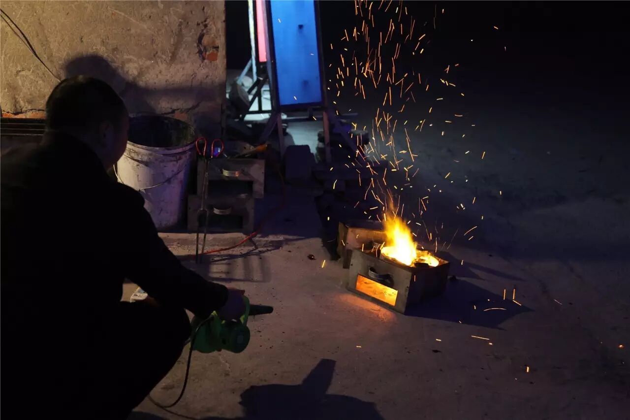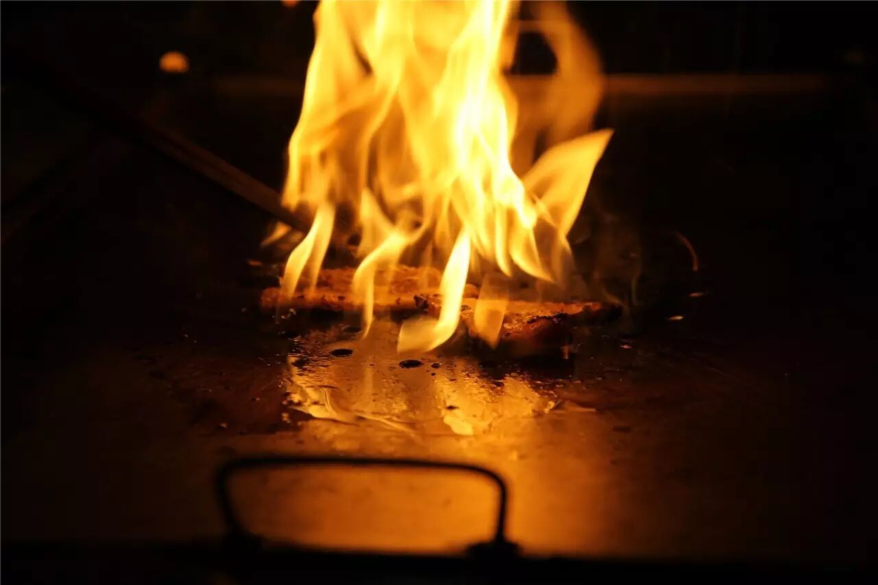 将浸泡过调料油汤的肉片往铁板上一刷,肉片上的油被铁板下的炭火一激,火苗瞬间将肉片灼熟。