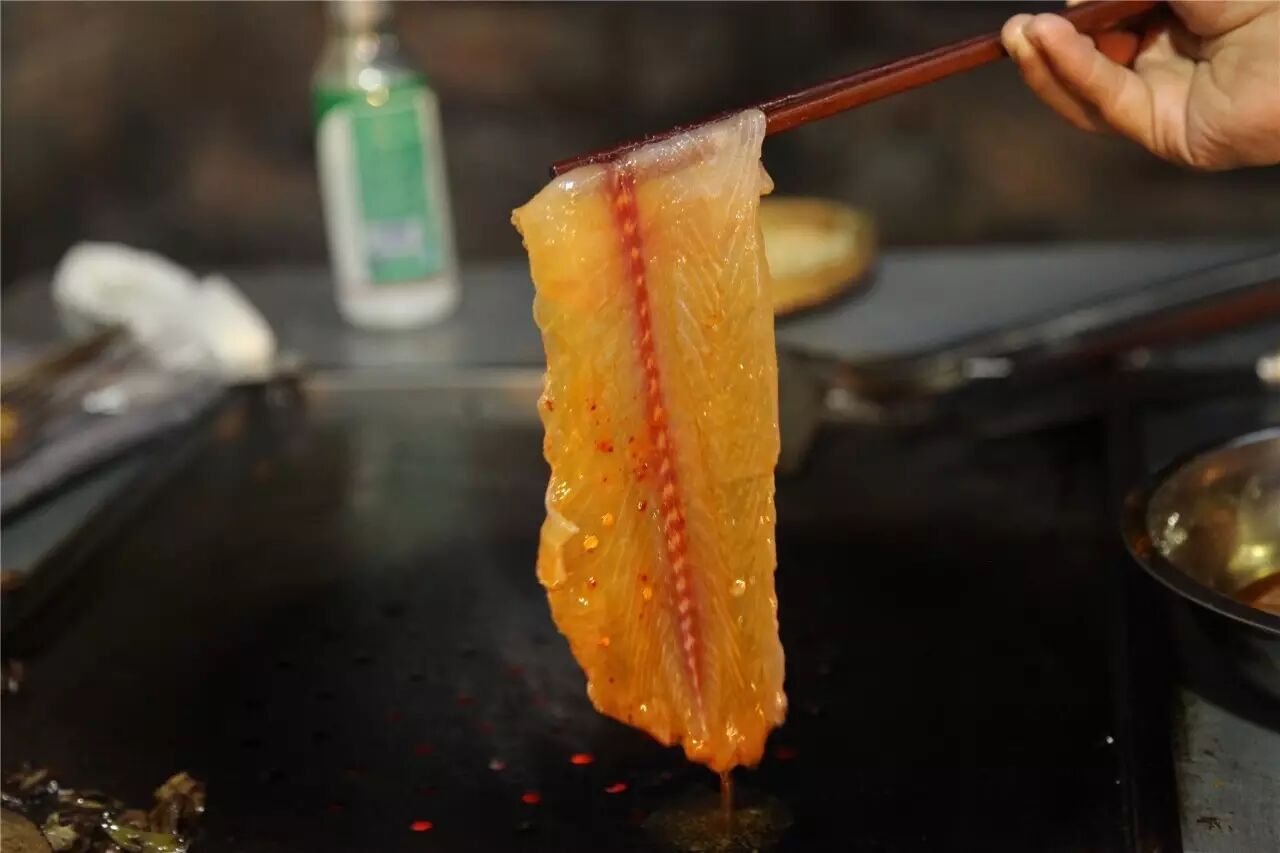 不同的食材有区分开来的做法,五花肉是必点菜,浸泡过调料油汤的肉片往铁板上一刷,肉片上的油被铁板下的炭火一激,火苗瞬间将肉片灼熟,稍有点辣的调料烤得外皮焦香。