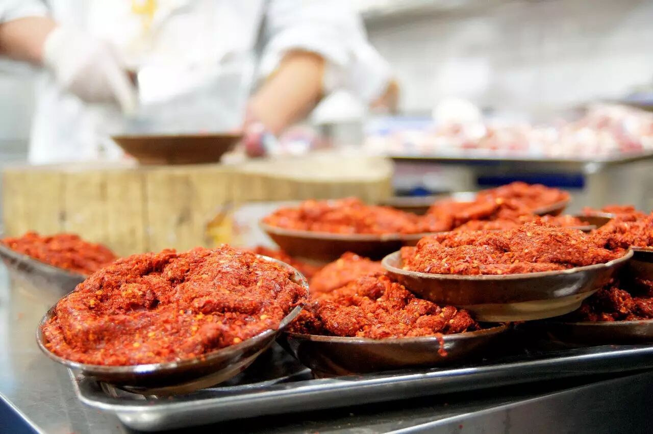 一个锅底大概会有4、5斤牛油,用滚烫的汤汁融化后,另外要加上花椒、辣椒、豆瓣等调味品。