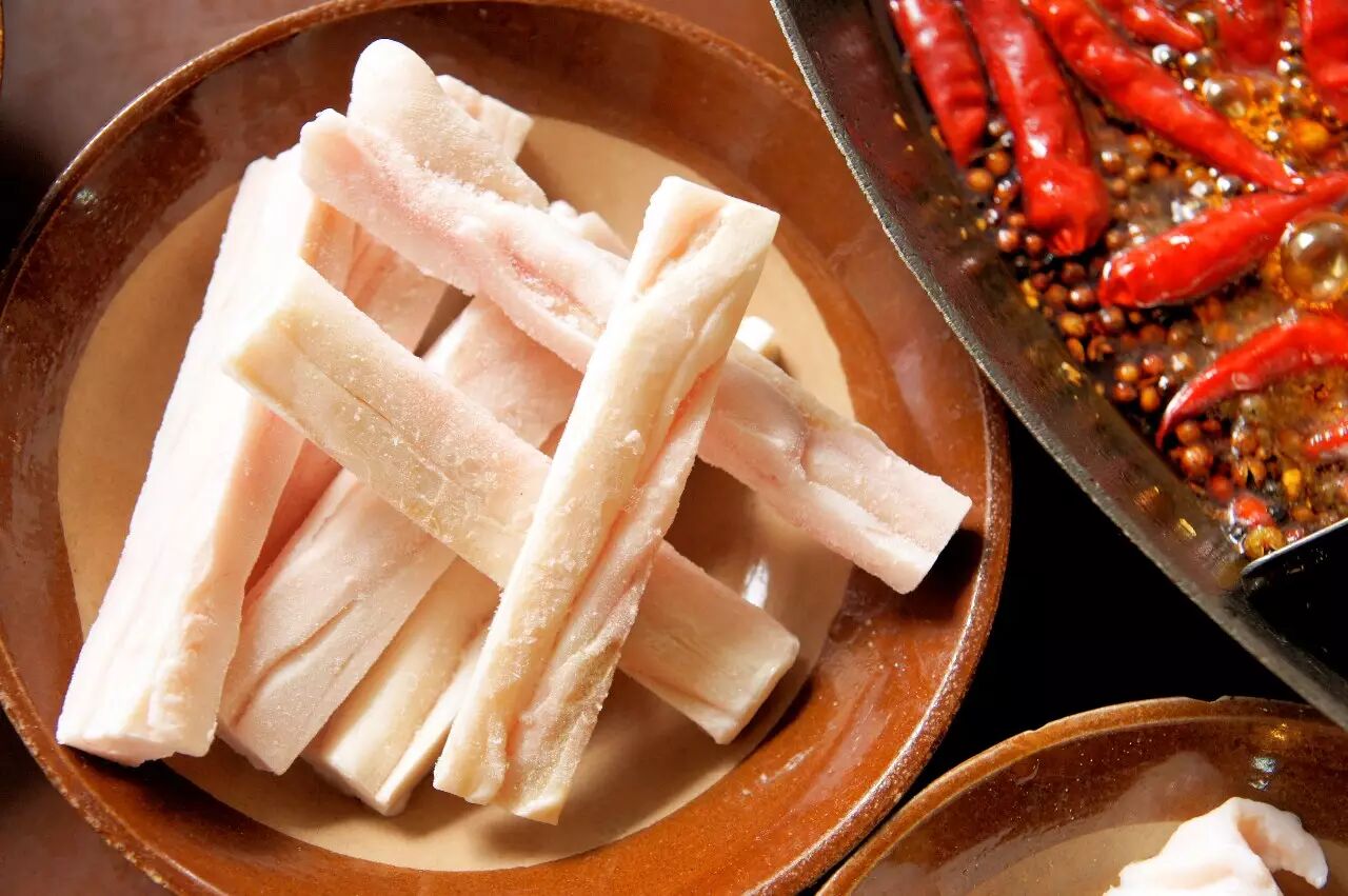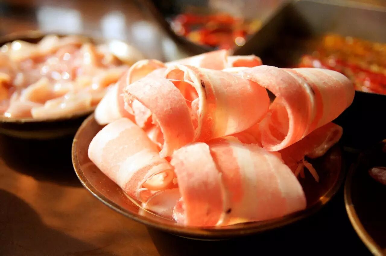 吃火锅涮牛羊肉的都有,但好像偏偏少了涮猪肉的。重庆火锅就有猪的三线肉,肉上无血,肥瘦红白分明。烫好入口,带皮的部分弹牙耐嚼,肥肉多汁瘦肉纤细,在嘴里上演着奇妙地味觉相遇。