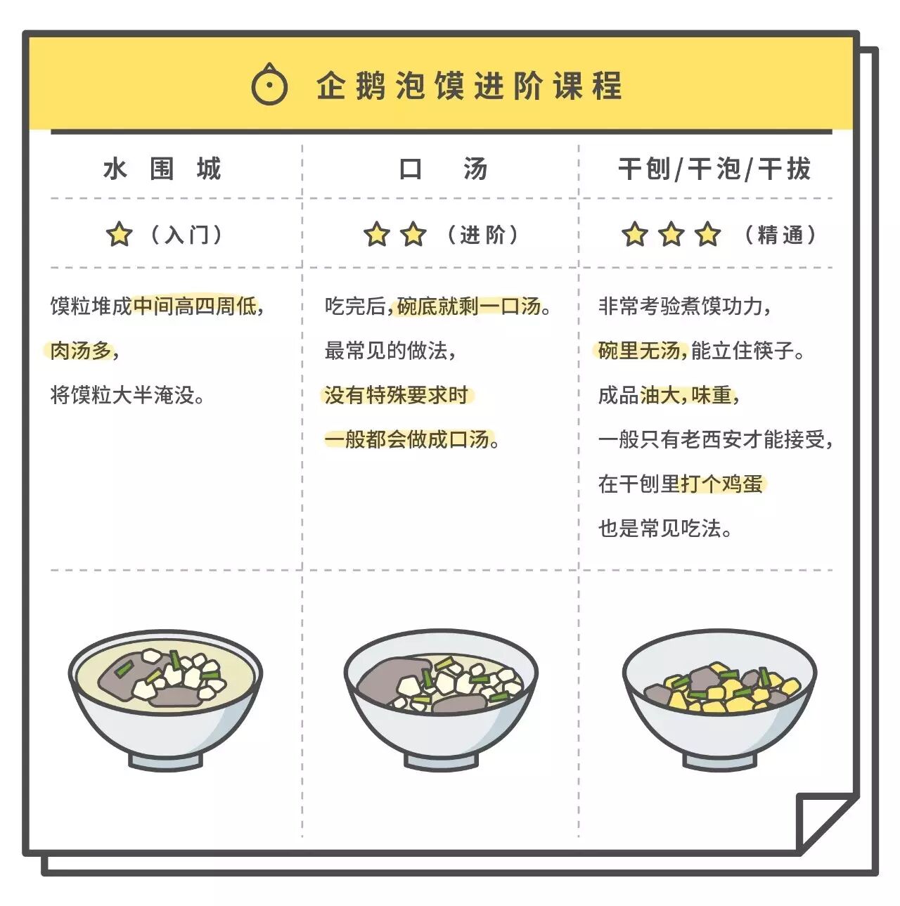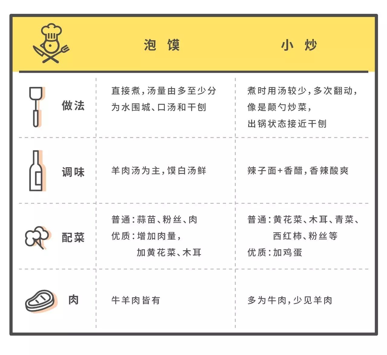 小炒泡馍,其实也是煮出来的,只是在锅里要不断翻搅,看起来像炒菜。它跟泡馍的区别,看这张表就懂了:
