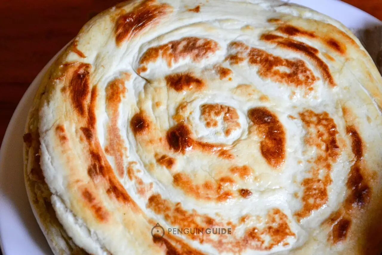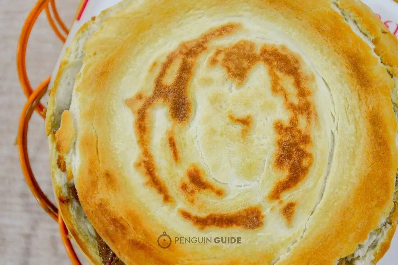 打好的馍胚先在鏊子上烙到八成熟,再烤至微鼓。拿出来圆如满月,酥脆金黄,名曰:“铁圈虎背菊花心”。外皮酥脆得能听见响,内里香软还不能粘牙。用刀横切一个小口,轻轻一捏,一缕热气飘出,馍自动分离成“两张皮”,毫不费力。如果有幸吃到这么完美的馍,鹅君送你五个字——且吃且珍惜。