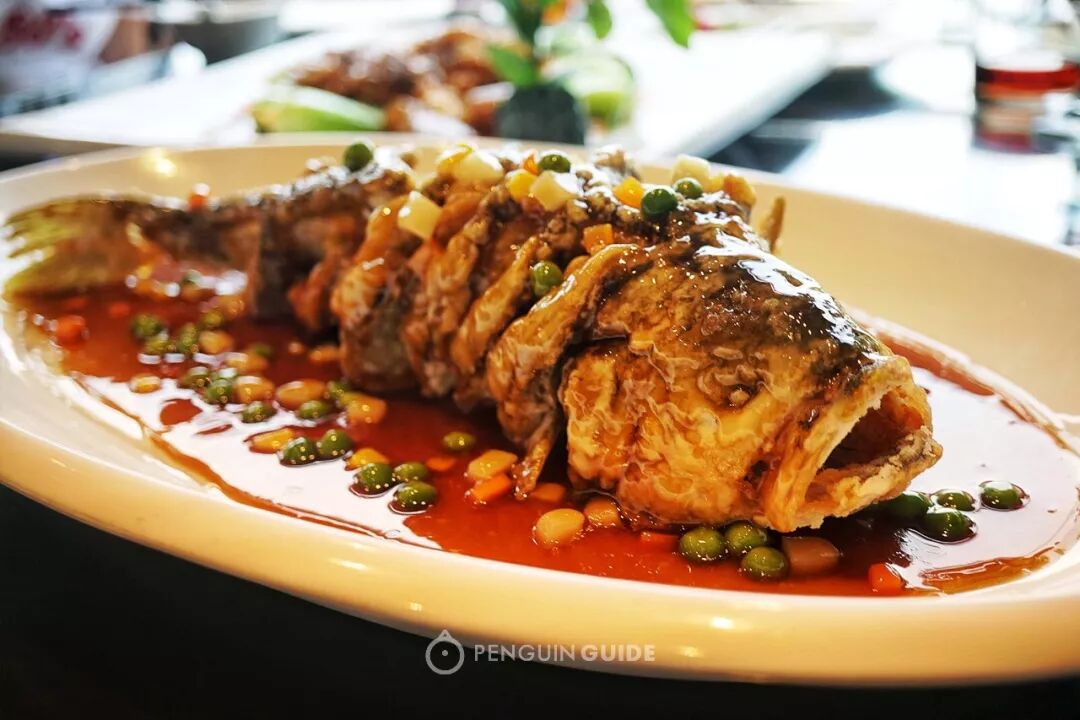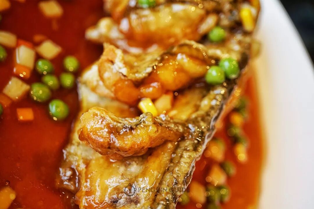 类似西湖醋鱼,却是完全不同的刀法。炸溜黄鱼是牡丹花刀,西湖醋鱼是柳叶花刀,这其中的细微差别没有对比过恐怕很难发现。