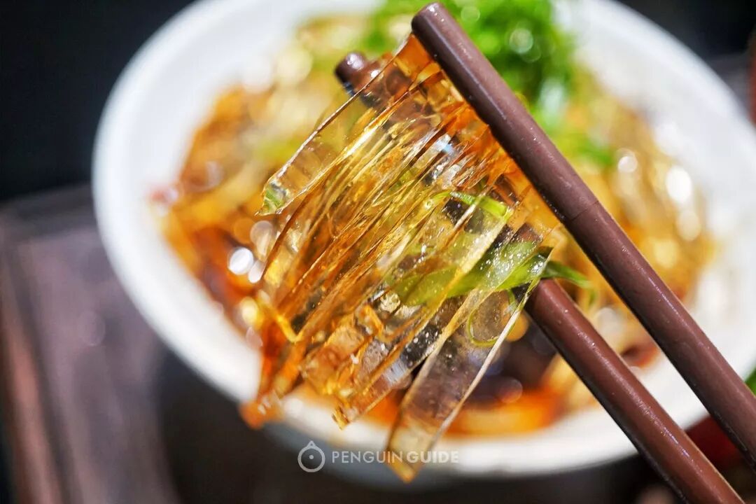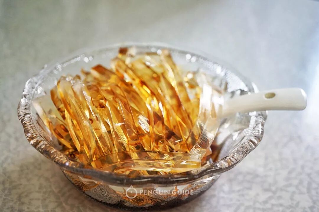 晶莹通透的一条条胶冻,染上了漂亮的酱油色,看似Q弹,入口便会融化,鲜香十足——如果吃到明显有弹性的口感,有可能掺了明胶,毕竟用纯鱼胶做成本不低。