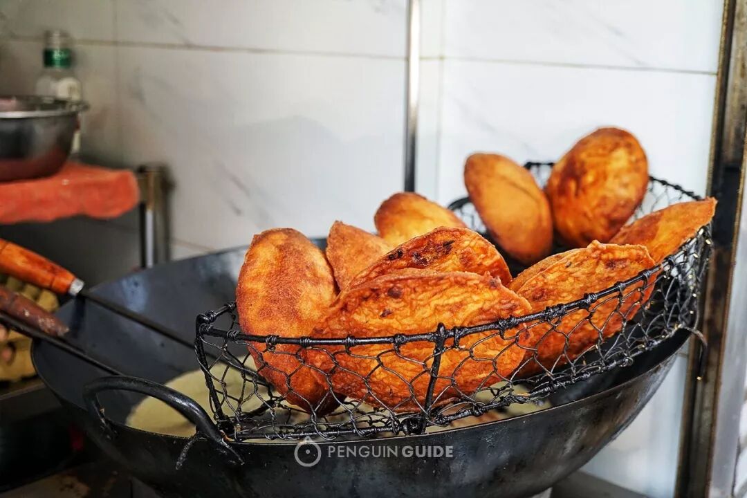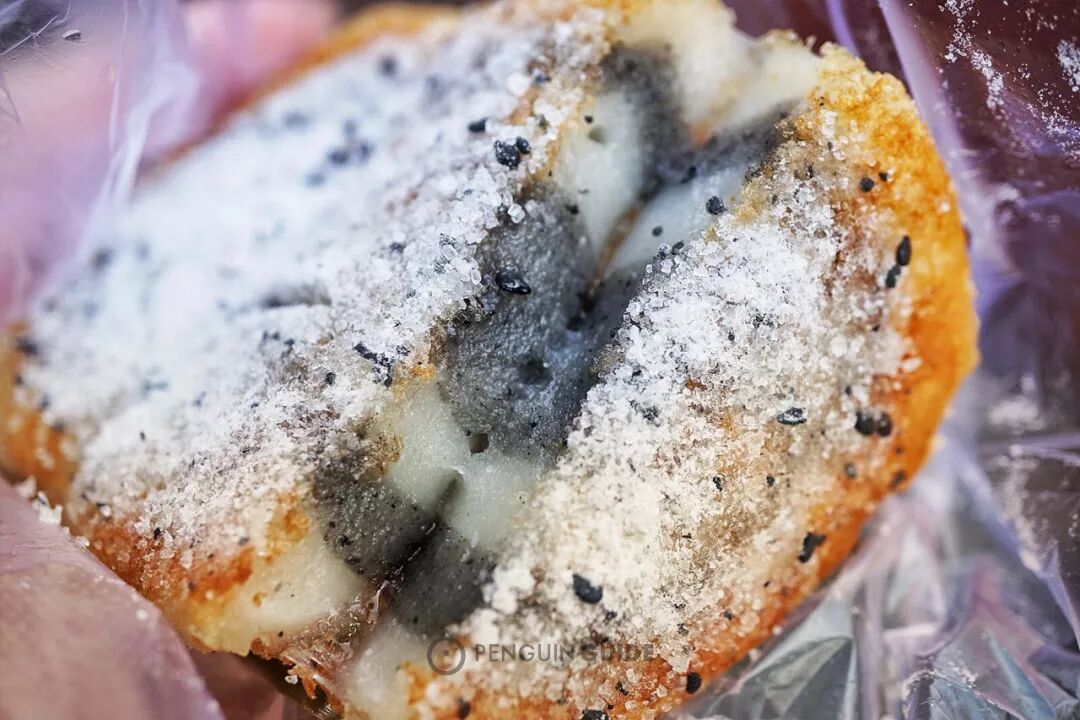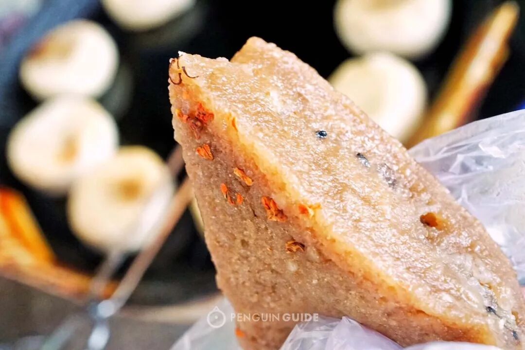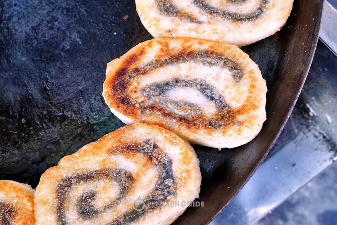 猪油糕,糯米饼的一种,原味和豆沙味卷到一起,在锅里用油煎过,再撒上一层白砂糖和黑芝麻,别提有多香了。你可能已经发现,温州人的甜食黄金搭配是「油炸+白砂糖+黑芝麻」。