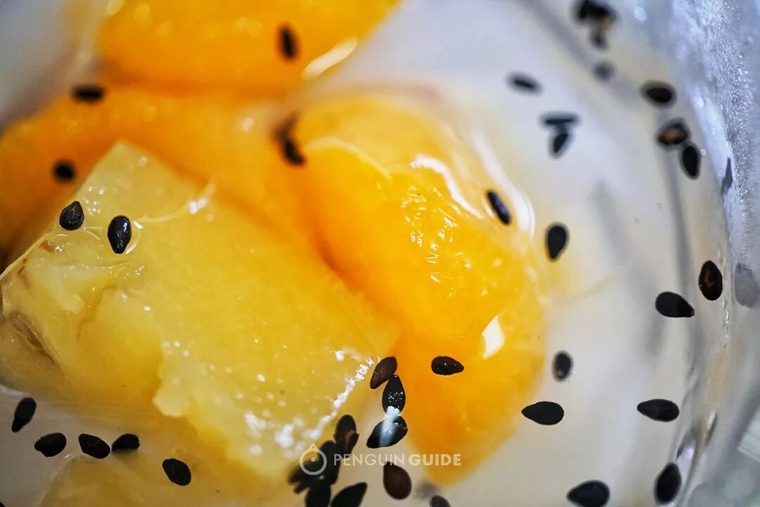 杏仁腐,和杏仁没啥关系,一片片白色的是椰奶加琼脂做成,混入橘子、菠萝、提子等水果罐头,还有杨梅干和黑芝麻。清凉解渴,又很香甜,本地人夏天最爱的冷饮,没有之一。