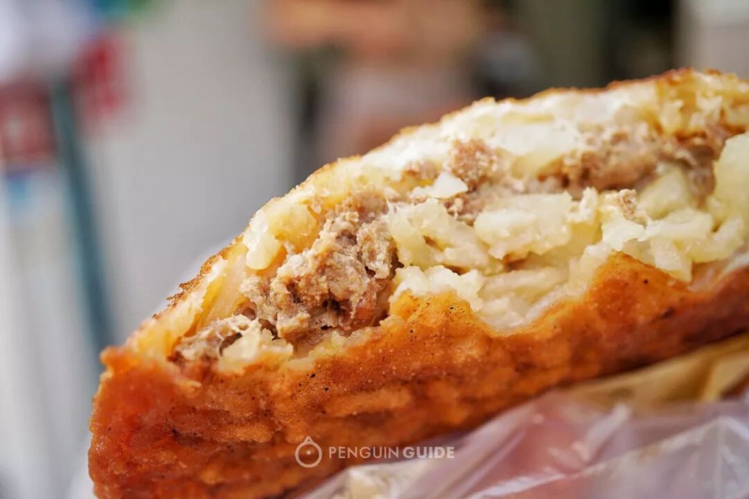 扁头灯盏糕,外皮是米浆混合面粉加调料,炸过后金黄香脆,咬进去里面的馅料很丰富:白萝卜丝很鲜甜,猪肉是提前腌过的,剁得细碎,吃起来新鲜又入味。