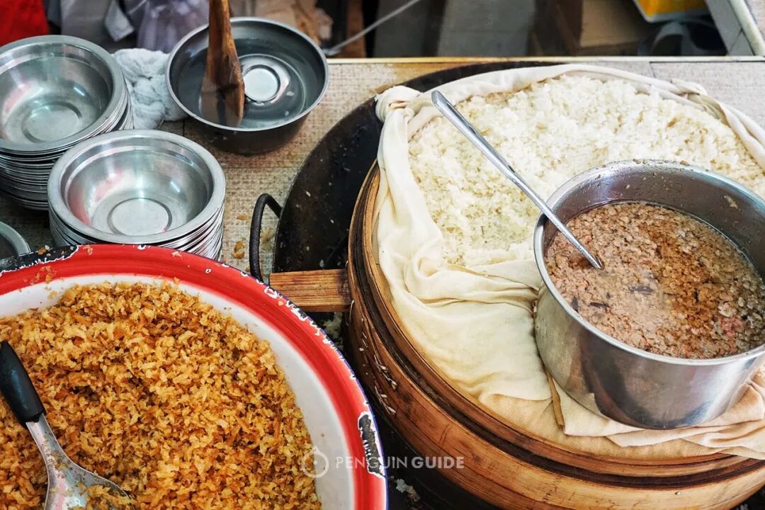 老板熟练地从蒸笼里挖一勺糯米,浇上肉汁,铺上油条,最后撒上葱花,这碗满满碳水的糯米饭,是每个当地人一天的开始。