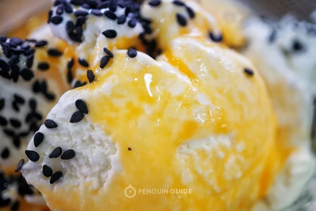蛋打冰淇淋,将生鸡蛋浇在冰淇淋上,照例撒上黑芝麻(温州人简直是黑芝麻狂魔)。冰淇淋口感一般,会吃到冰渣,是小时候常见的冰品无疑了。