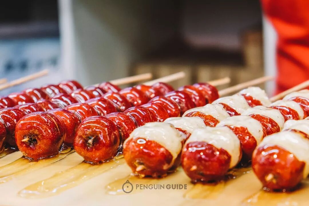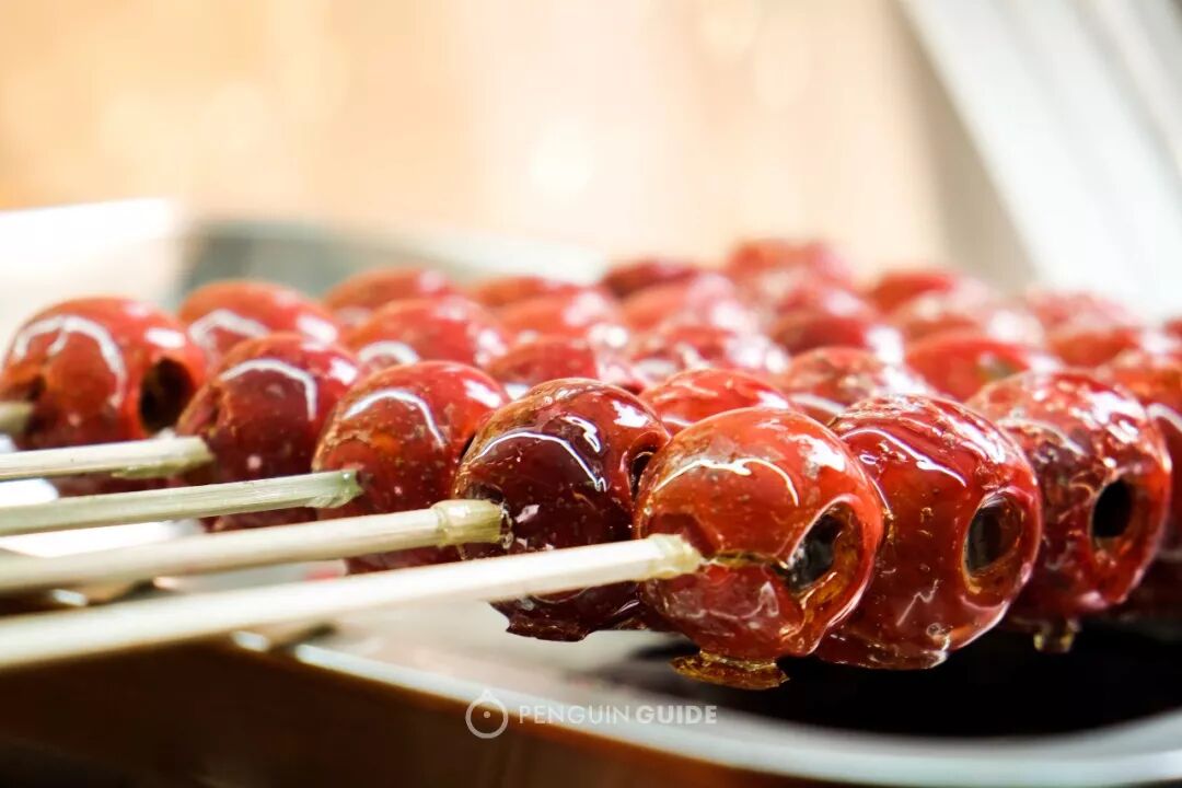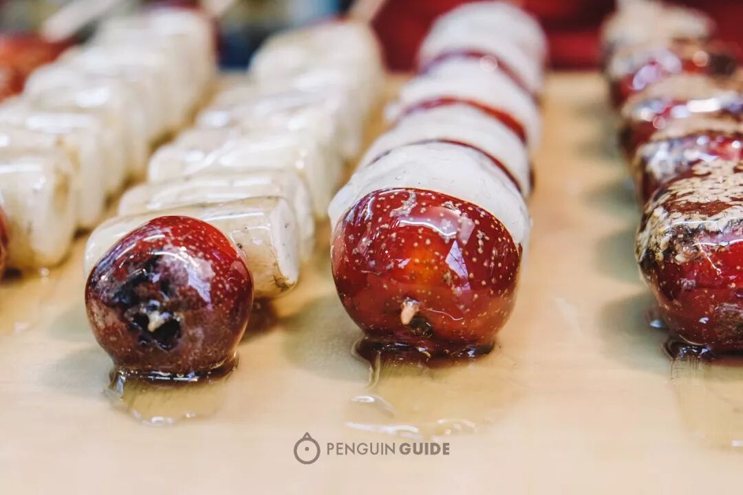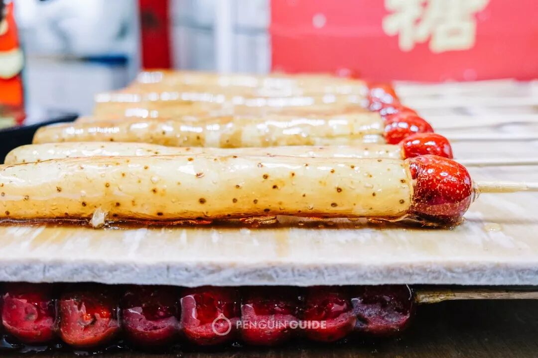 同样在东四北大街,有一家便利车店,摆出的糖葫芦花样繁多,山楂夹豆沙味道最妙。山楂丝丝酸味,但微甜豆沙中和了酸度,淡淡香糯又丰富口感。