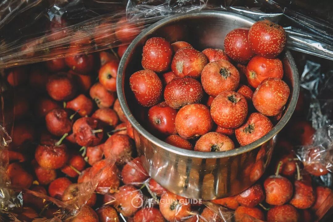 但不推荐熟红果糖葫芦,把山楂煮熟压扁,用的其实多是挖坏的山楂,或是本来就有坏的坑。山楂的酸劲儿被驯服了,糖葫芦没了魂。再满的芝麻粒子,也没法添香了。