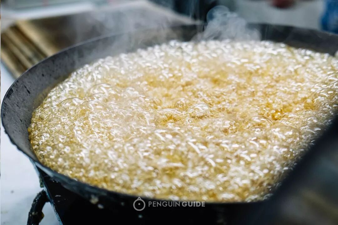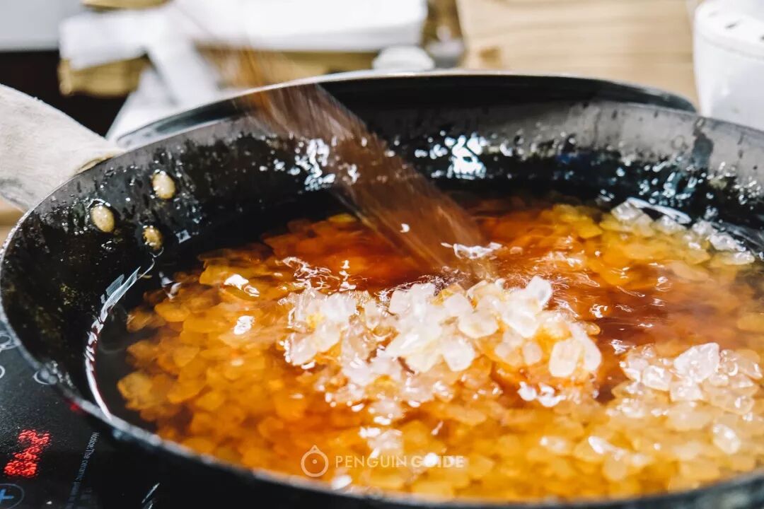 大块的冰糖入锅熬制,翻起金黄色啤酒沫似的细腻泡沫。做了21年糖葫芦的王师傅,不必像别的店家一样用筷子蘸糖稀入凉水,来判断熬的程度。直接挑一丝糖入口,就能判断出蘸糖葫芦的时机。如此做出来的糖葫芦,不粘牙,嘎嘣脆,让人想起小时候的好味道。