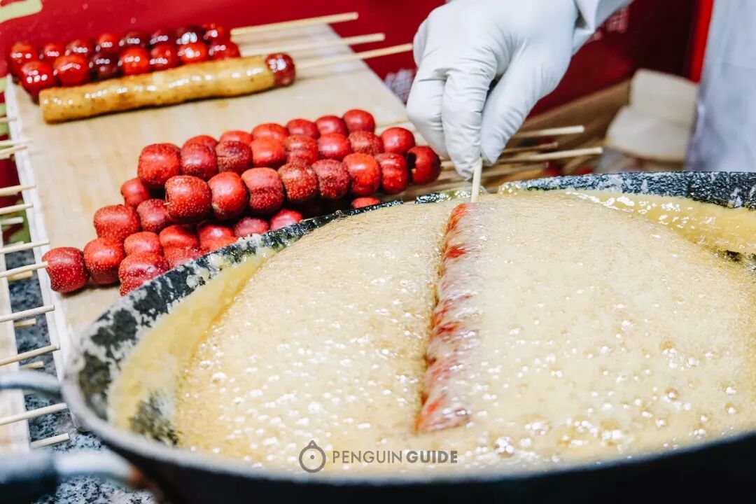 冰糖入锅熬起大泡,翻滚着成为小泡,最后渐渐转为金黄,就得赶紧动手蘸糖葫芦。早一分则粘牙,晚一分糖就发苦,全靠师傅凭经验把控。
