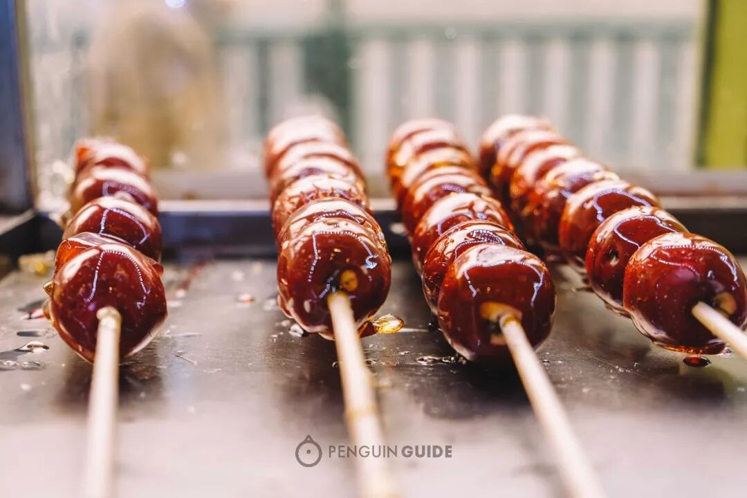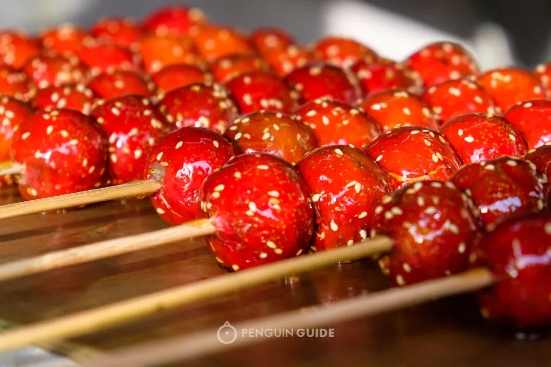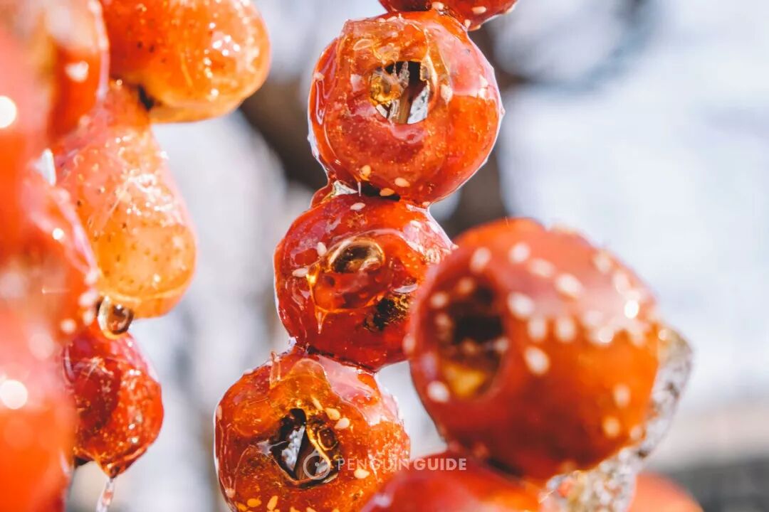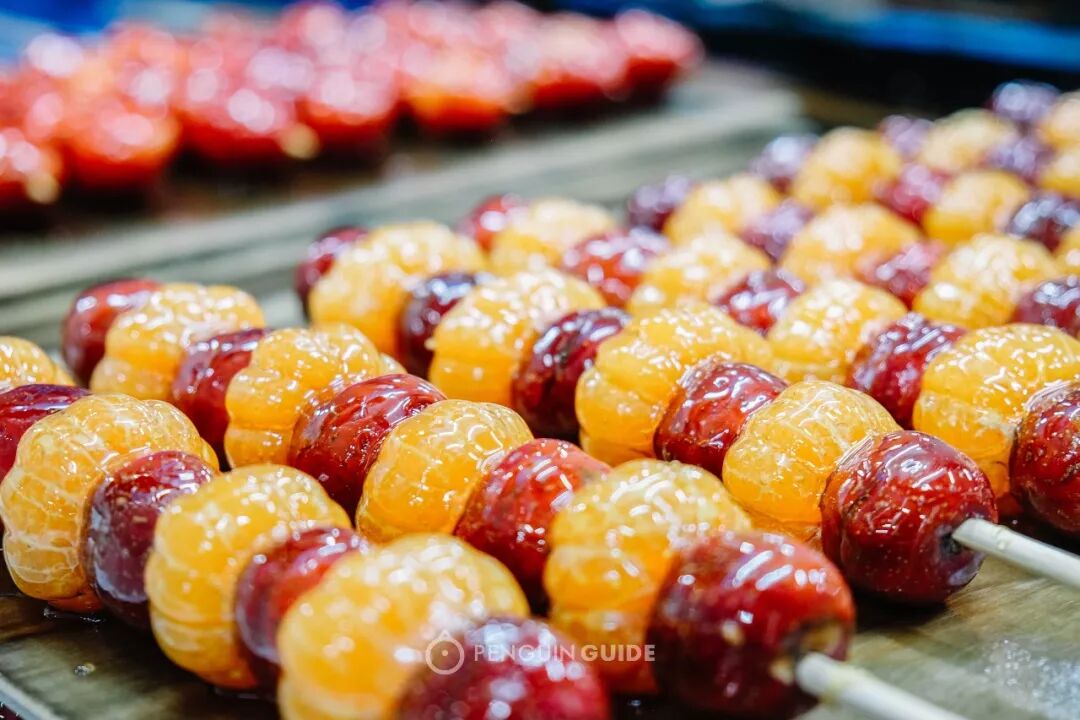 还有选材新鲜的橘子糖葫芦,水汁鲜甜。