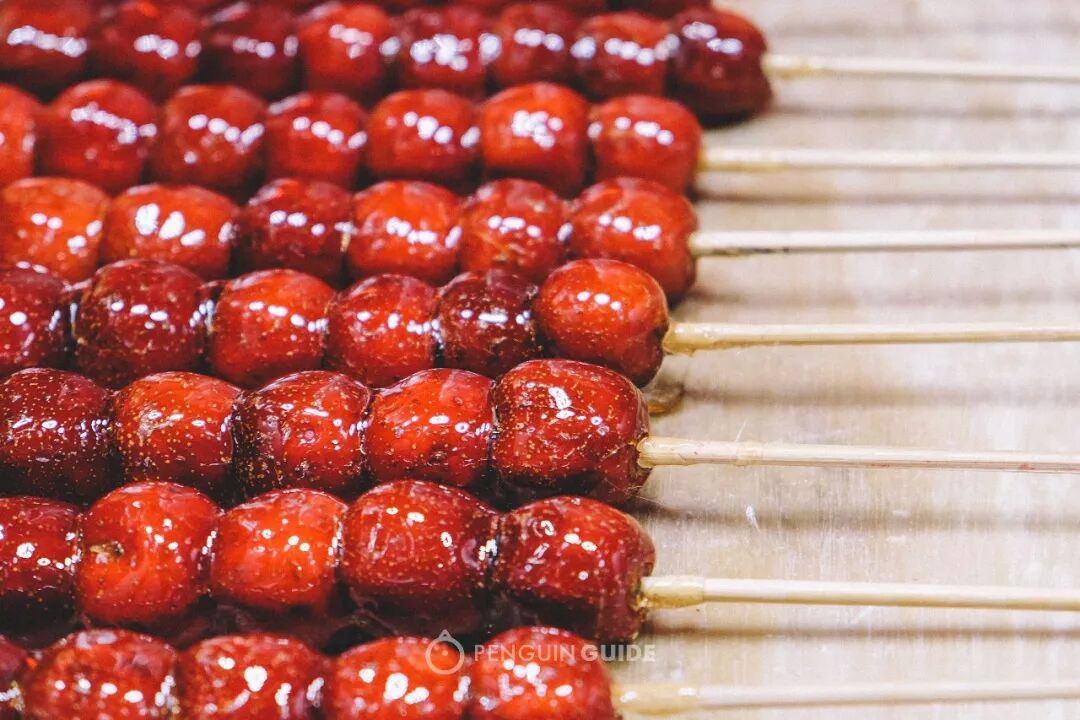 这种老北京传统小吃,要动用多种感官郑重品鉴。看红彤彤的果子配上晶莹剔透的糖挂,送到嘴边,启齿轻咬,嘎嘣脆——冰糖破裂的清脆声音,就是对耳朵的美味犒赏。
