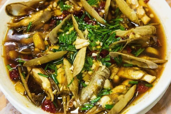 先把外壳夹碎,用当地特色的酱料红烧而成,肉质脆嫩,鲜香入味。