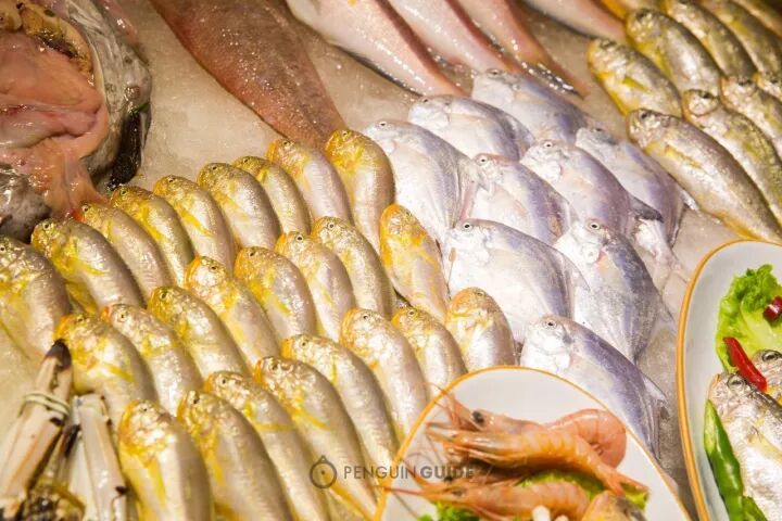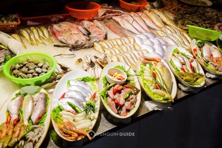 所有食材统统摆出来,五色缤纷的海鲜整齐排列,实在招人眼球,稍大一点的餐馆就能把食材区变成水族馆: