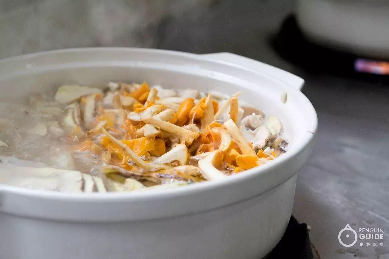 特别是口感发脆而不够嫩滑的菌子,比如青头菌,才冒出来的小菌苞很鲜嫩,炒吃破坏鲜味,用鸡汤或肉片一起煮,能弥补菌子本身的清淡。