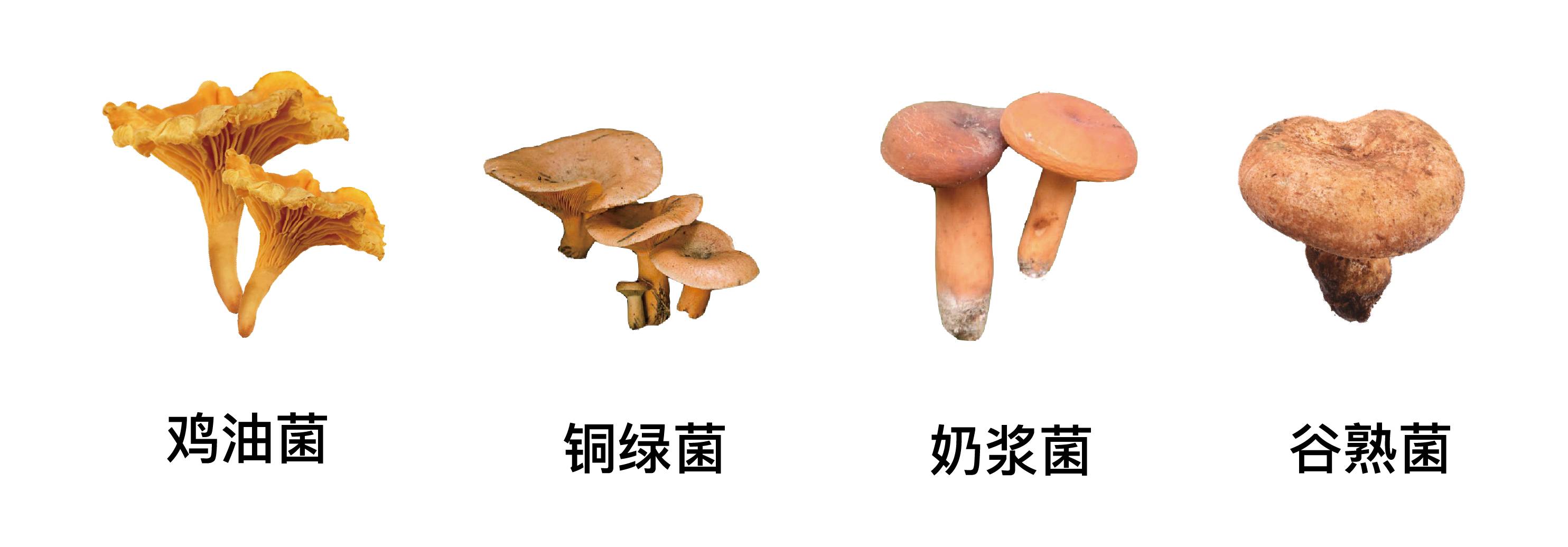 杂菌中可圈可点的菌子并不少,比如奶浆菌、铜绿菌、谷熟菌和鸡油菌,体型大小都相似,颜色分别是暗橘红、黄铜色、小麦黄和鲜黄色,口感或脆或糯各有不同,是四位姐妹花。