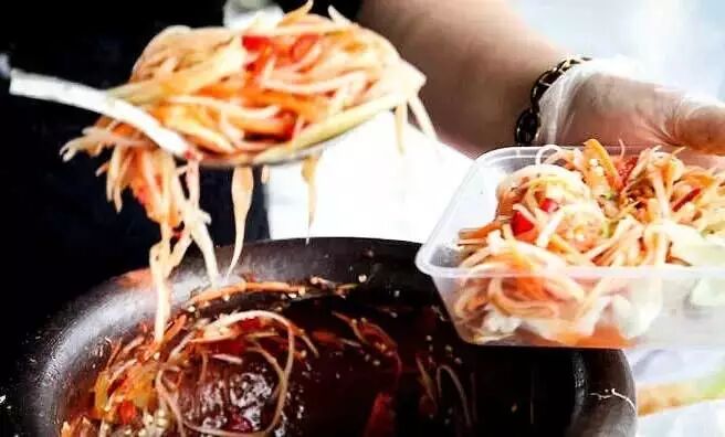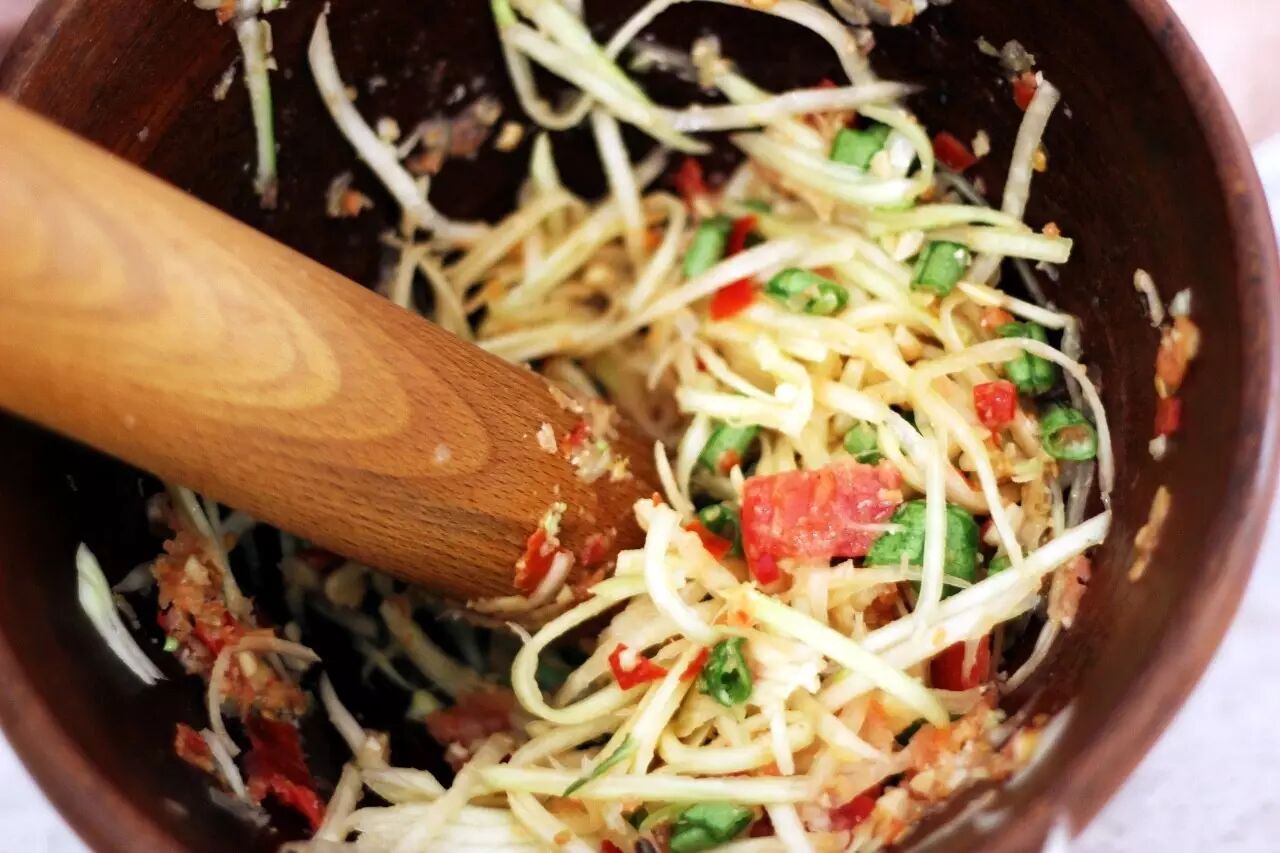 你可能已经在泰国街头见过这种木桶舂出来的“papaya salad”(somtam),但夏天在篆新市场的新闻路门,你会发现一家舂菜小摊上,不止青木瓜,鸡脚筋、生芒果、凉黄瓜……你能想到的都能放进去一起舂。
