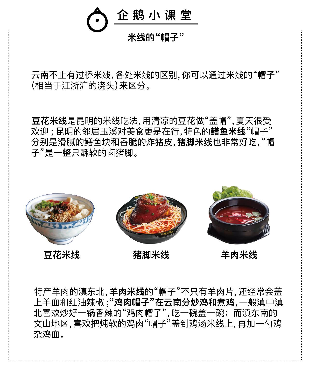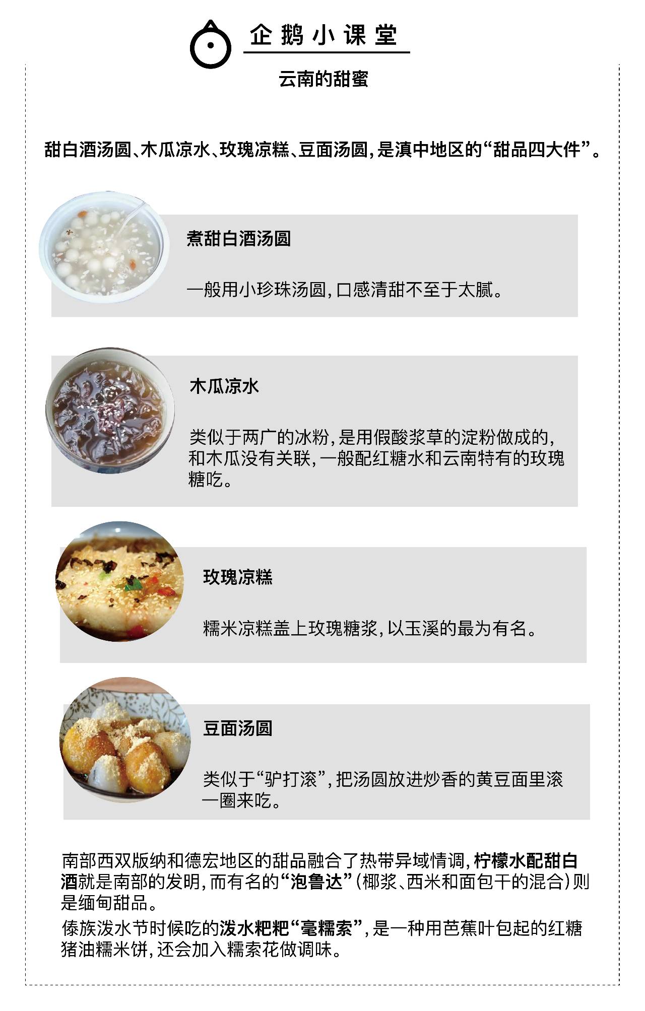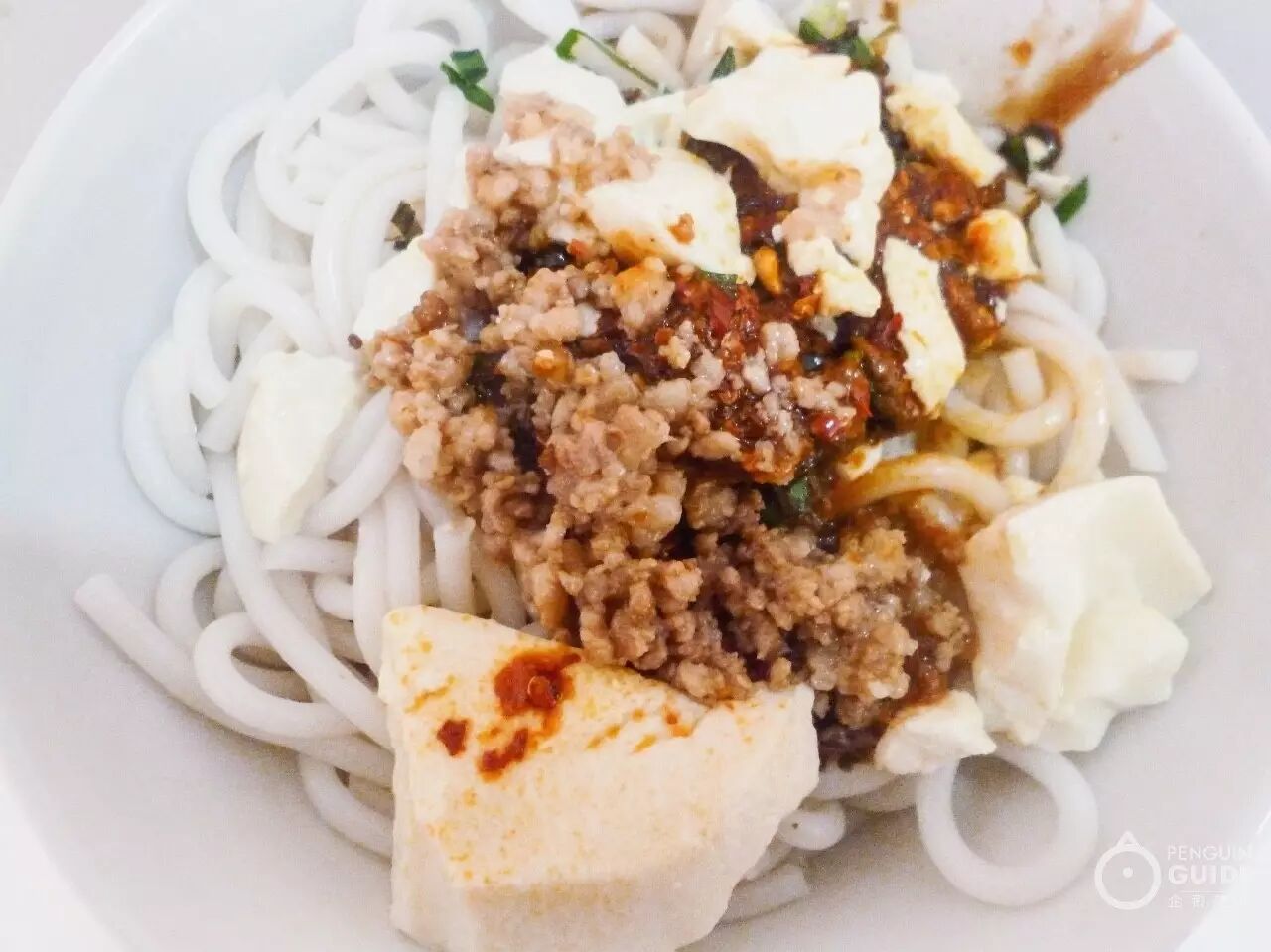 豆花米线的制作方法介于凉拌和卤之间,清甜的豆花中和了冬菜的咸和油辣椒的辣,再加上碎花生提香,配上甜品玫瑰木瓜凉水或招牌豆面汤圆,吃饱喝足不过十块钱。