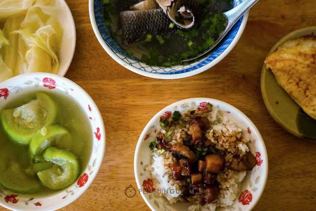 台南更是自成一格,因地利之便,养殖渔业发达,几乎每摊都供应新鲜鱼汤,加上各式当季蔬菜清炒,在餐台上一字排开,价格贴心,任君挑选。饿了就走到家巷口的肉燥饭店,点上一整桌小菜,朴实又丰盛。