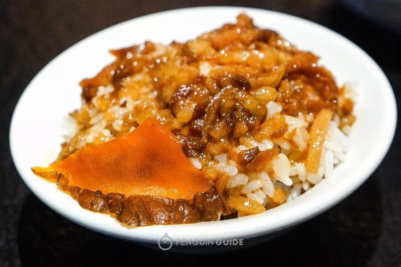 每一批卤肉都自中央工厂出品,将猪颈肉切成细长条,加上酱油、胡椒、各式香料,卤得十分入味。除了严加控管原料来源和配方比例,成品还得经科学仪器测试,甜咸形状都得达标,增减一分都不行,品质四平八稳,不必担心踩雷。米饭也是极佳,浇上卤肉,浓淡相宜,卤肉软绵绵地化在嘴中,一口接一口。