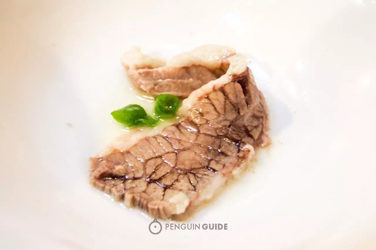 牛肉是少见的牛胸肉(胸口靠大腿一段),切成薄片,大理石似的纹理,尝得到牛肉的原味,一口吃下去,软嫩的口感让舌尖完全舒展,再绽放出肉质的鲜味。