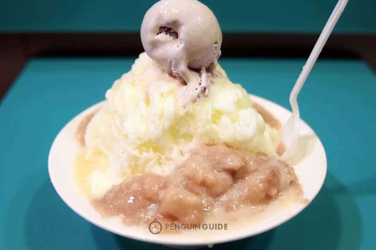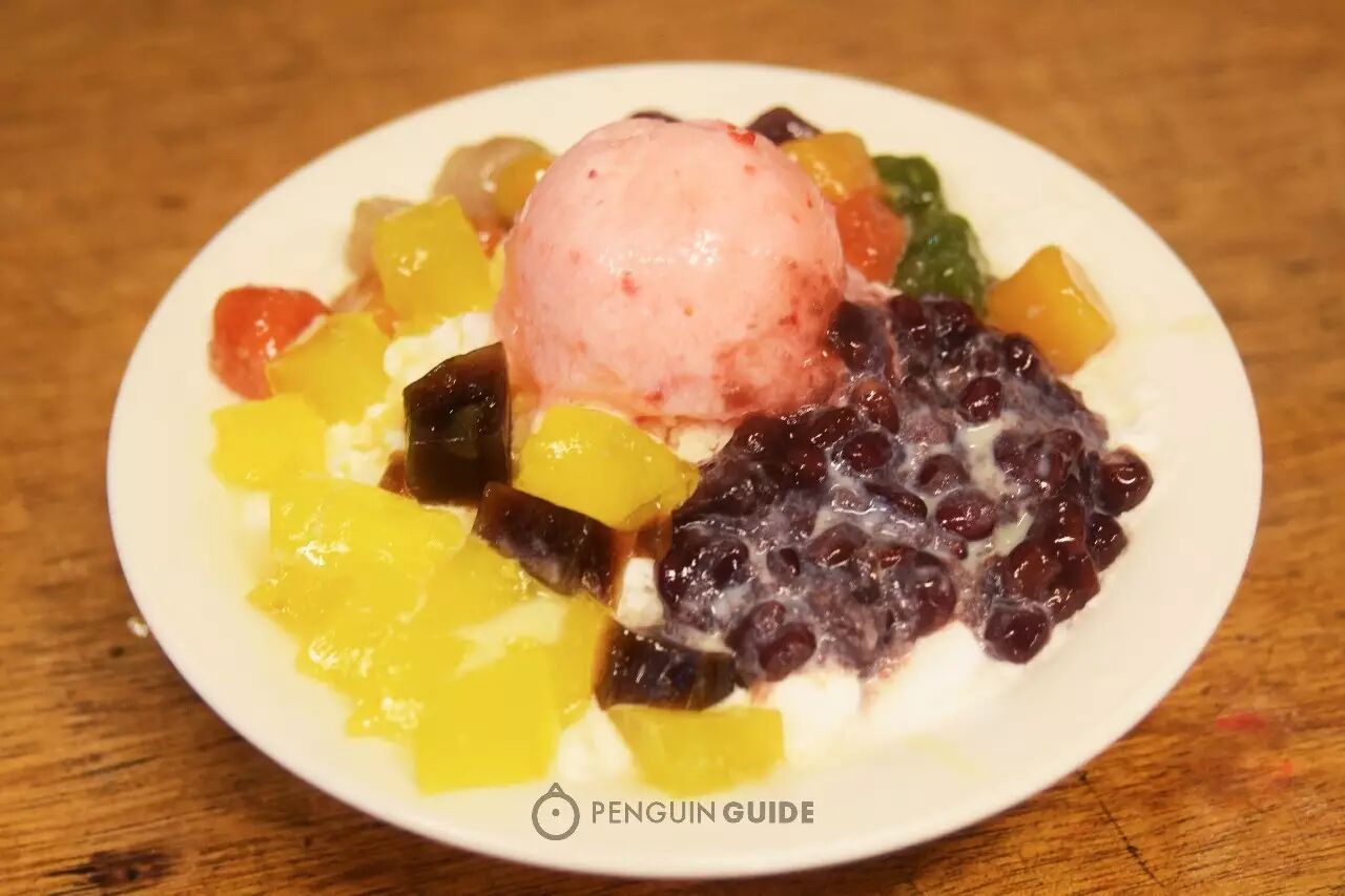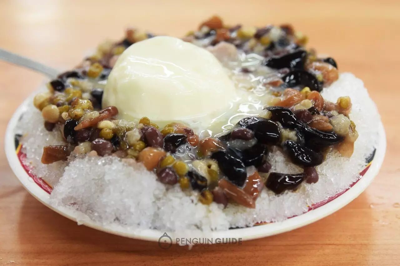 企鹅君的最爱是“奶酪八宝牛奶冰”。简单的剉冰,淋上糖水和炼乳后盖上八宝,满满一碗端上桌。这里八宝冰的特别之处在于,一众配料都混合在一起,每一口吃下去都能尝到豆类的香甜绵密,仙草的滑嫩清爽和芋头及Q圆的扎实口感,相当不错。