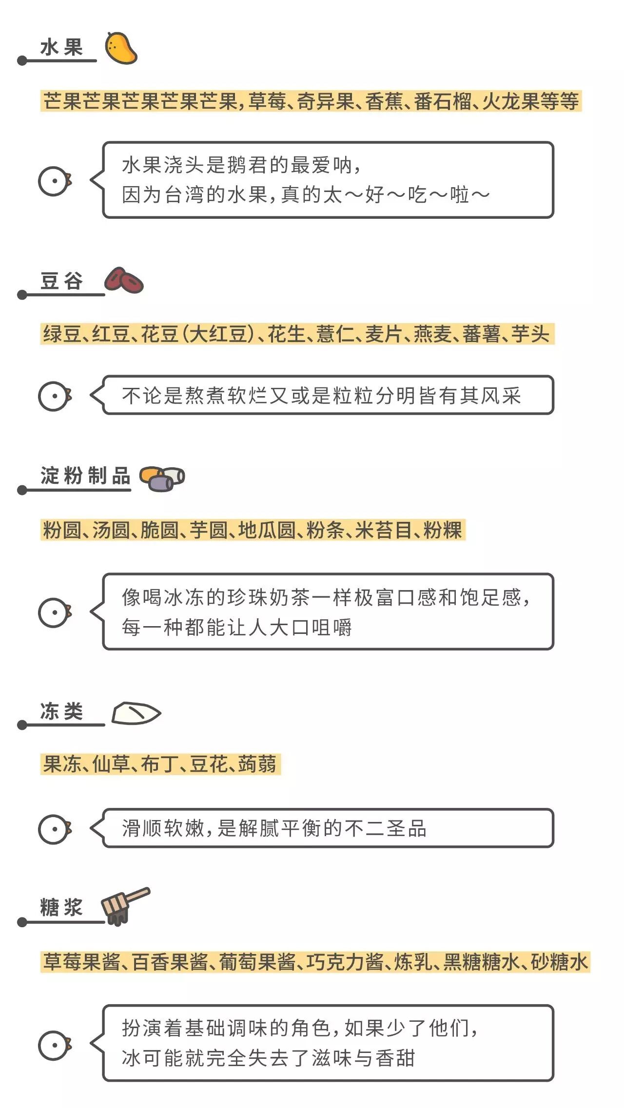 一般来说,配料分为糖浆、水果、冰淇淋、淀粉制品、豆谷杂粮与冻类等,每个种类的特色皆大不相同。