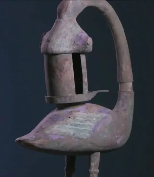 雁鱼铜灯由雁头、雁体、灯盘和灯罩组成,灯盘和灯罩能够转动开合,不仅可以挡风,还可以调节光线的明暗度和照射角度。最令人惊叹的是,古代燃灯烟气很重,而在这盏灯点亮后,灯油产生的烟会顺着大雁颈部导入大雁的腹内,雁腹盛有清水,烟会溶于水中,从而起到净化空气的作用,避免了对环境的污染。