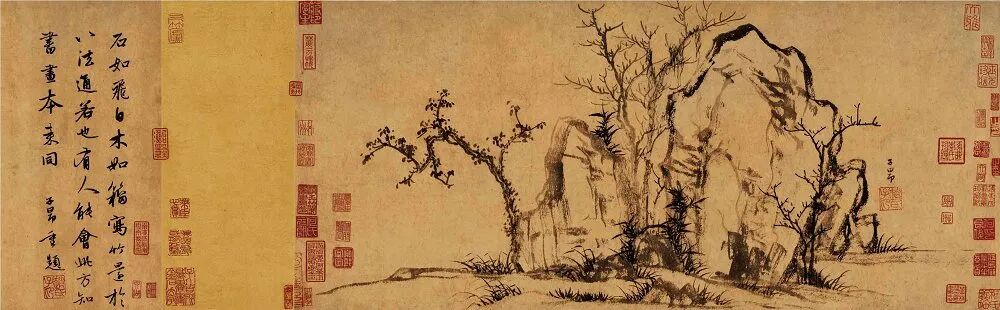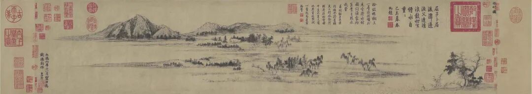 这也许是他的自谦,但这幅“信手涂来”的画却十分被后人看重,明代收藏家董其昌说:“独此卷为子昂得意笔,在《鹊华图》之上,以其萧散荒率,脱尽董巨窠臼,直接右丞,故为难耳。”乾隆这个“盖章狂魔”也是个迷弟,在画上盖了很多章,有十二方之多。乾隆已经很克制了。在他之前,纳兰性德居然留下了五十二方印章。盖一次章,就是点一次赞,可见他对这幅画的喜欢。