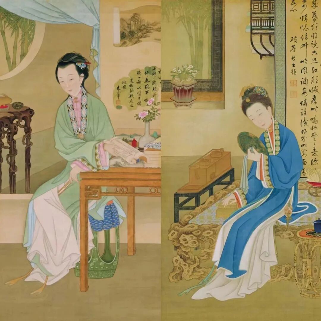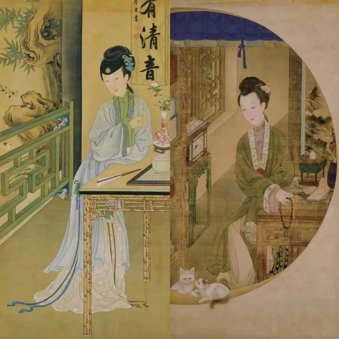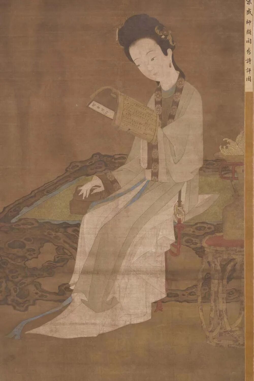 如果说《十二美人图》之“消夏赏蝶”中的女子在《胤禛行乐图》中出现过。其实,把眼光再放开去一些,《十二美人图》中“裘装对镜”的美人和宋代盛师颜《闺秀诗评图》中的女子非常像,简直是复制粘贴的水平,这又怎么解释呢?
