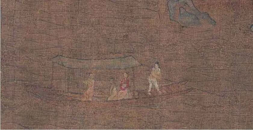 “游春”这个名字是宋徽宗起的。画面中,水天相接,上有青山叠翠,湖水融融,也有士人策马山径或驻足湖边,还有美丽的仕女泛舟水上,水面上微波粼粼,岸上桃杏绽开,绿草如茵。一派春意盎然。山水成为画中的主角,与人物有了正常的比例。搁以前,比如《洛神赋图》,人大于山,人和山是不成比例的。不仅如此,《游春图》还有了最原始的远景中景、前景之分,奠定了中国画平远、深远、高远的“三远”法则。《宣和画谱》称赞展子虔:“写江山远近之势尤工,故咫尺有千里趣。”